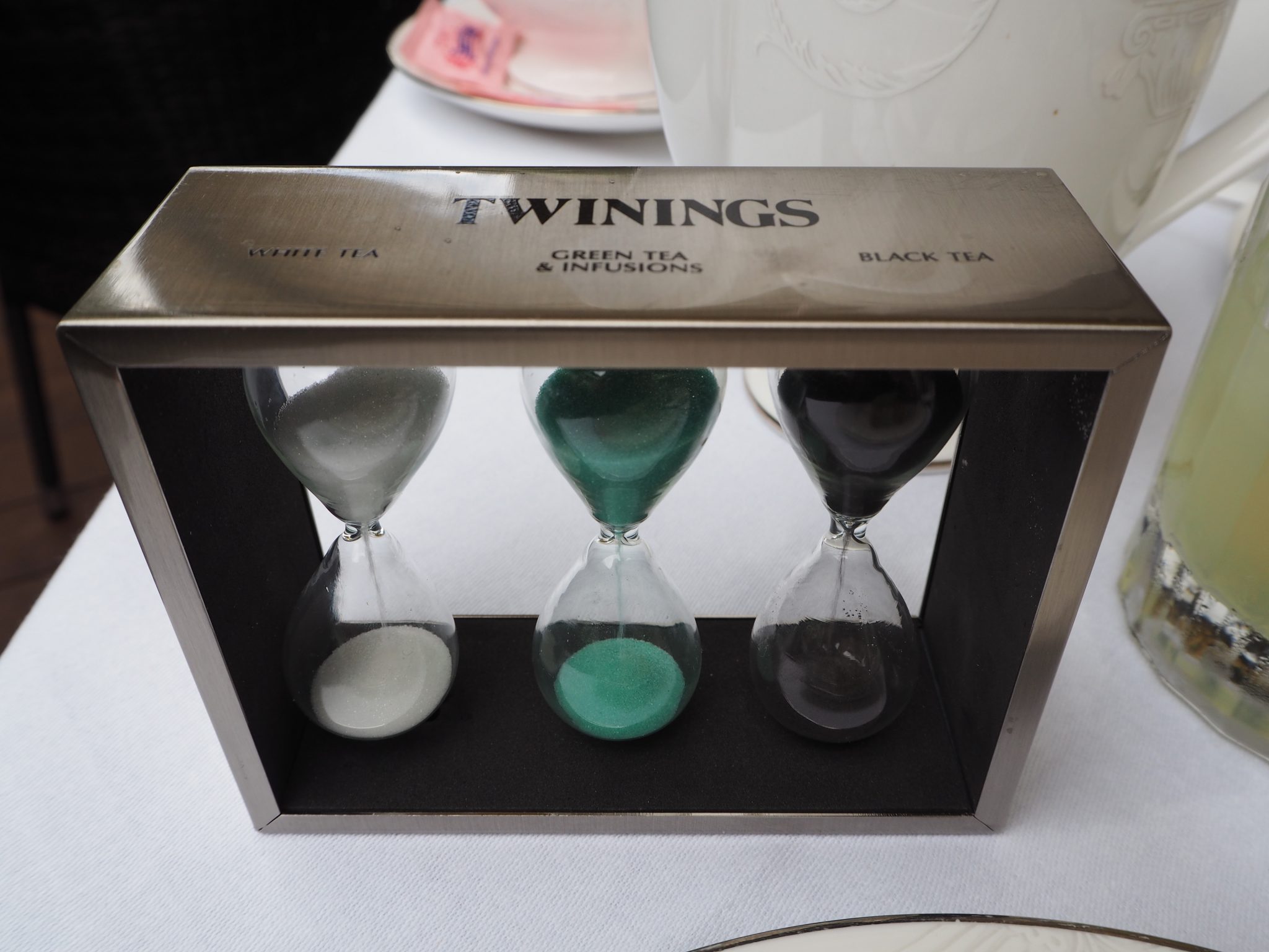 The tea is served in a very functional teapot that enables you to choose the strength of the infusion, with the help of a triple hourglass. When you’ve reached the desired brew, simply lift the container to stop the infusion. So brilliant, I bought the same one!