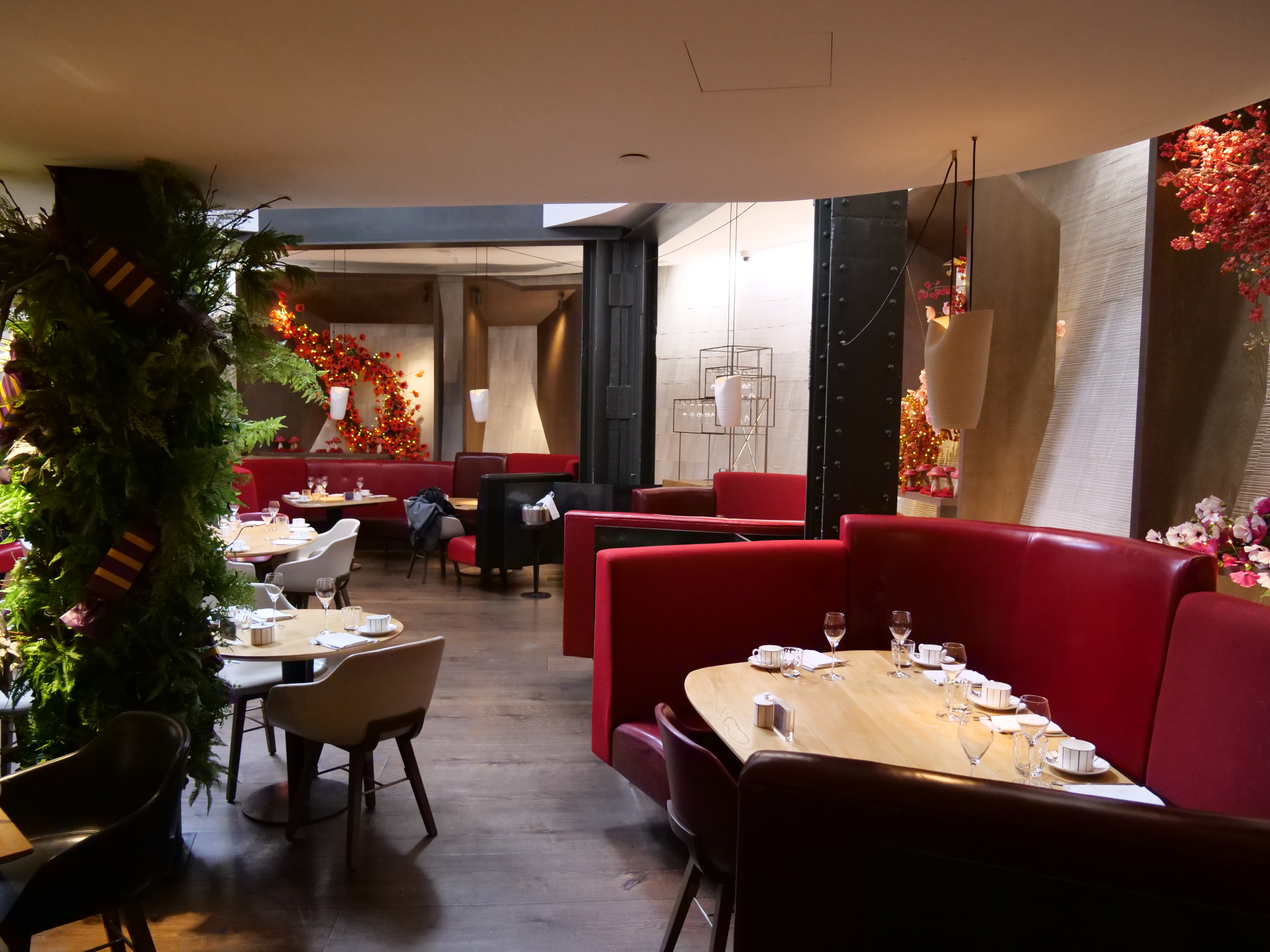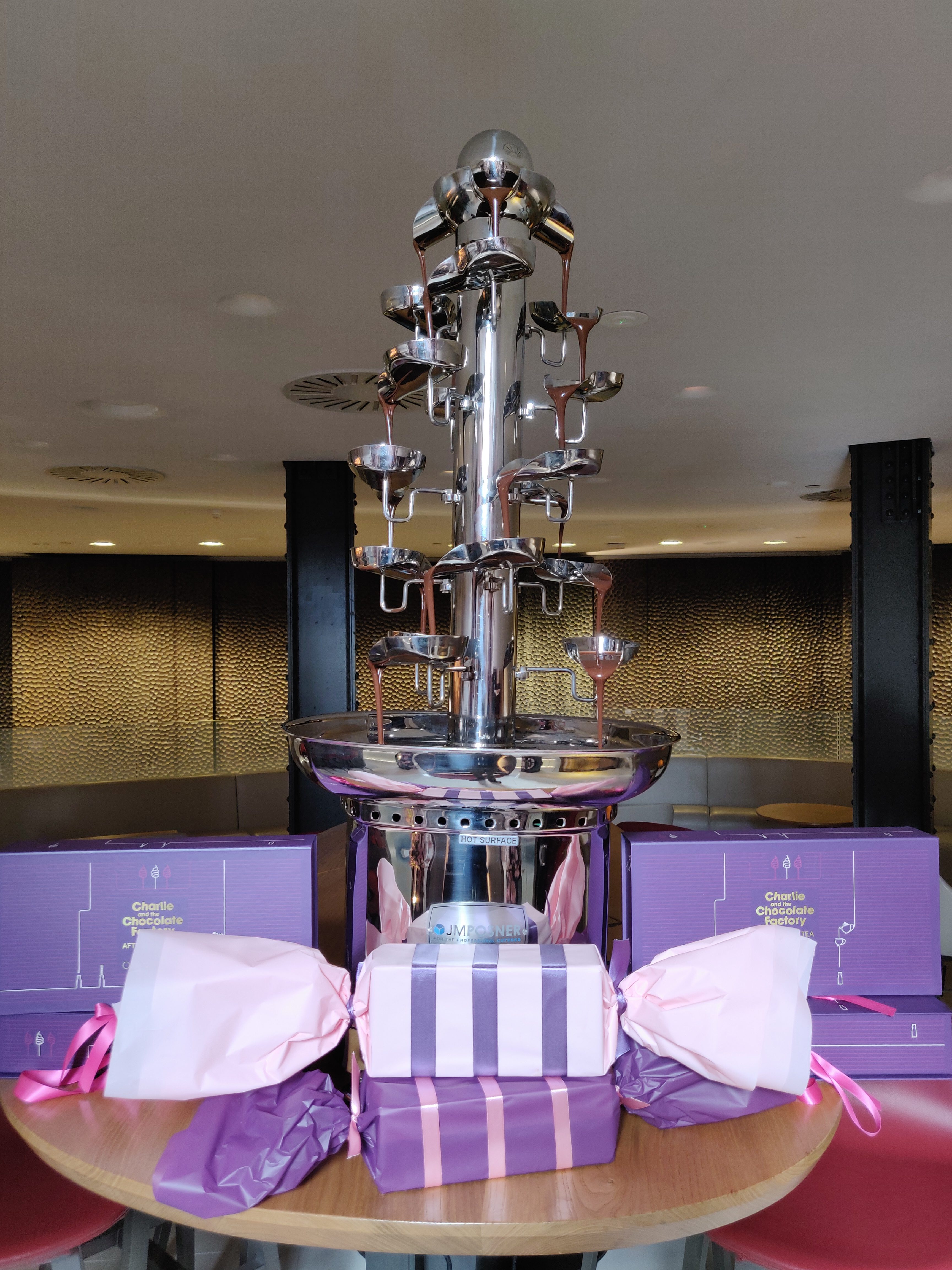 The Charlie afternoon tea is served in the Eneko restaurant, on the underground level. The basement level can be accessed through a separate door but not via the hotel lobby. The entrance itself is beautifully decorated with flowers, faux presents and a chocolate fountain.