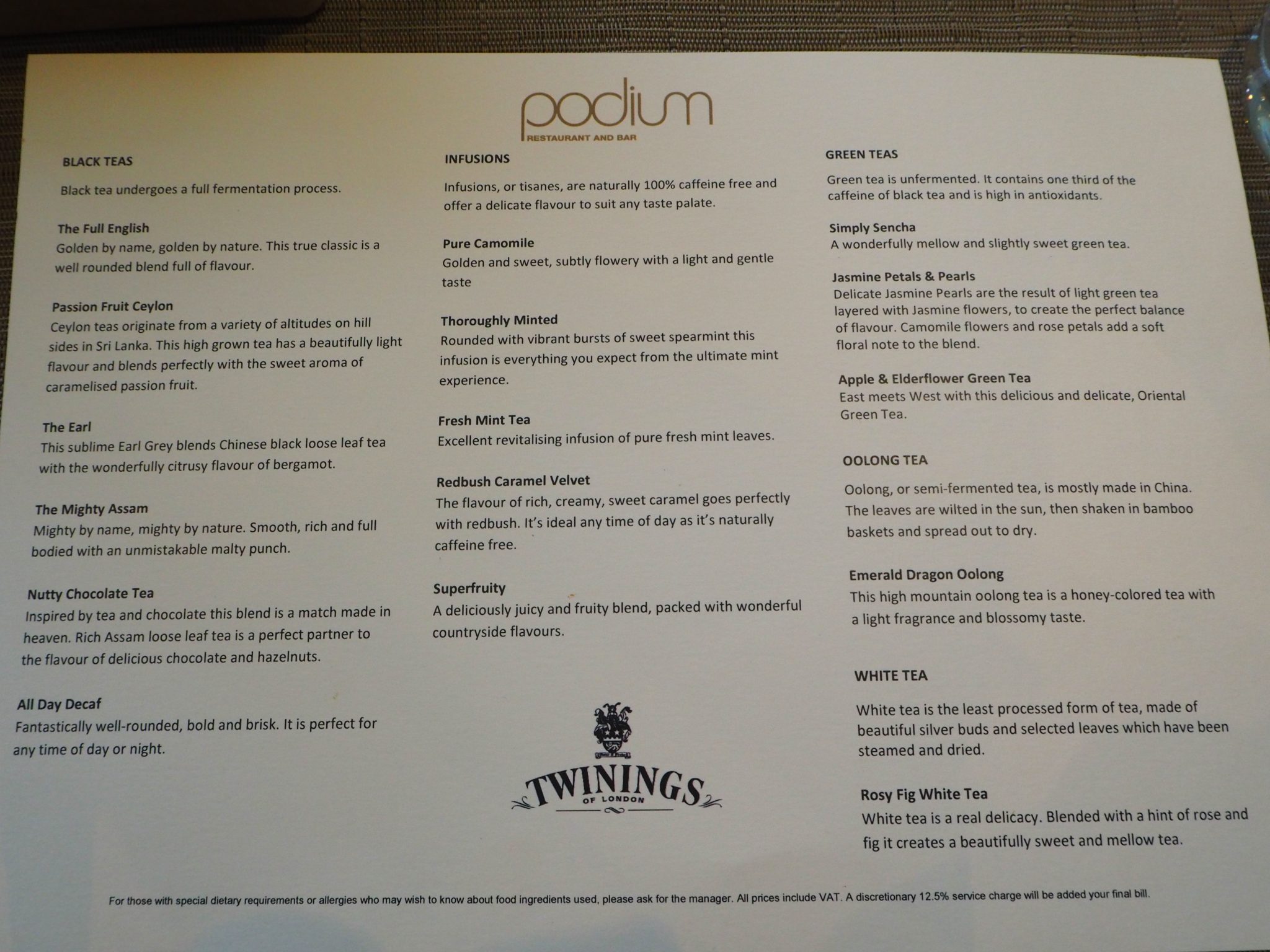 The afternoon tea is served in the Podium restaurant, which is a rather ordinary venue with no distinctive atmosphere. Something that I found quite odd and displeasing: you have to go up to the second floor to find the men’s washrooms.