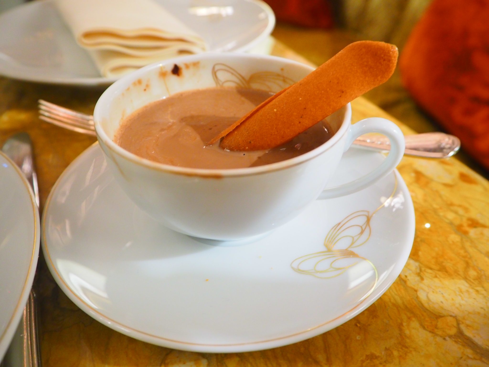 Il s’agit plutôt d’un dessert à part entière que d’une boisson, car c’est ainsi que l’a voulu le chef pâtissier. Je recommande de résister à la tentation et ne pas commander le chocolat chaud en début de repas car il risque de vous couper l’appétit.