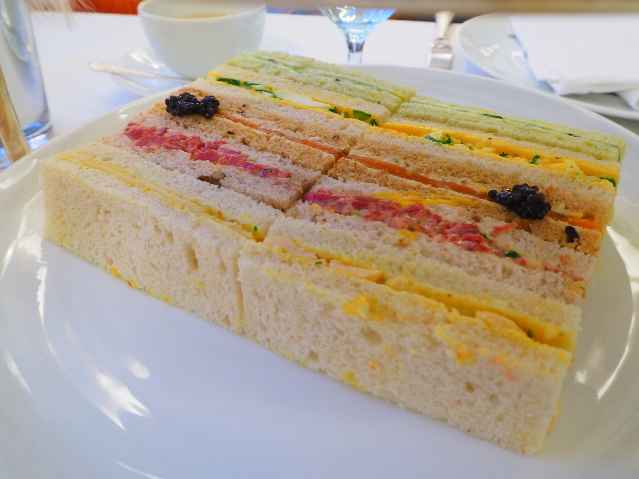 The savouries are the weakest part of this afternoon tea. They are tasty but they’re five rather ordinary sandwiches: “Egg & truffle”, “Scottish salmon and caviar”, “Homemade salt beef, horseradish”, “Cucumber and mint” and “Coronation chicken”.