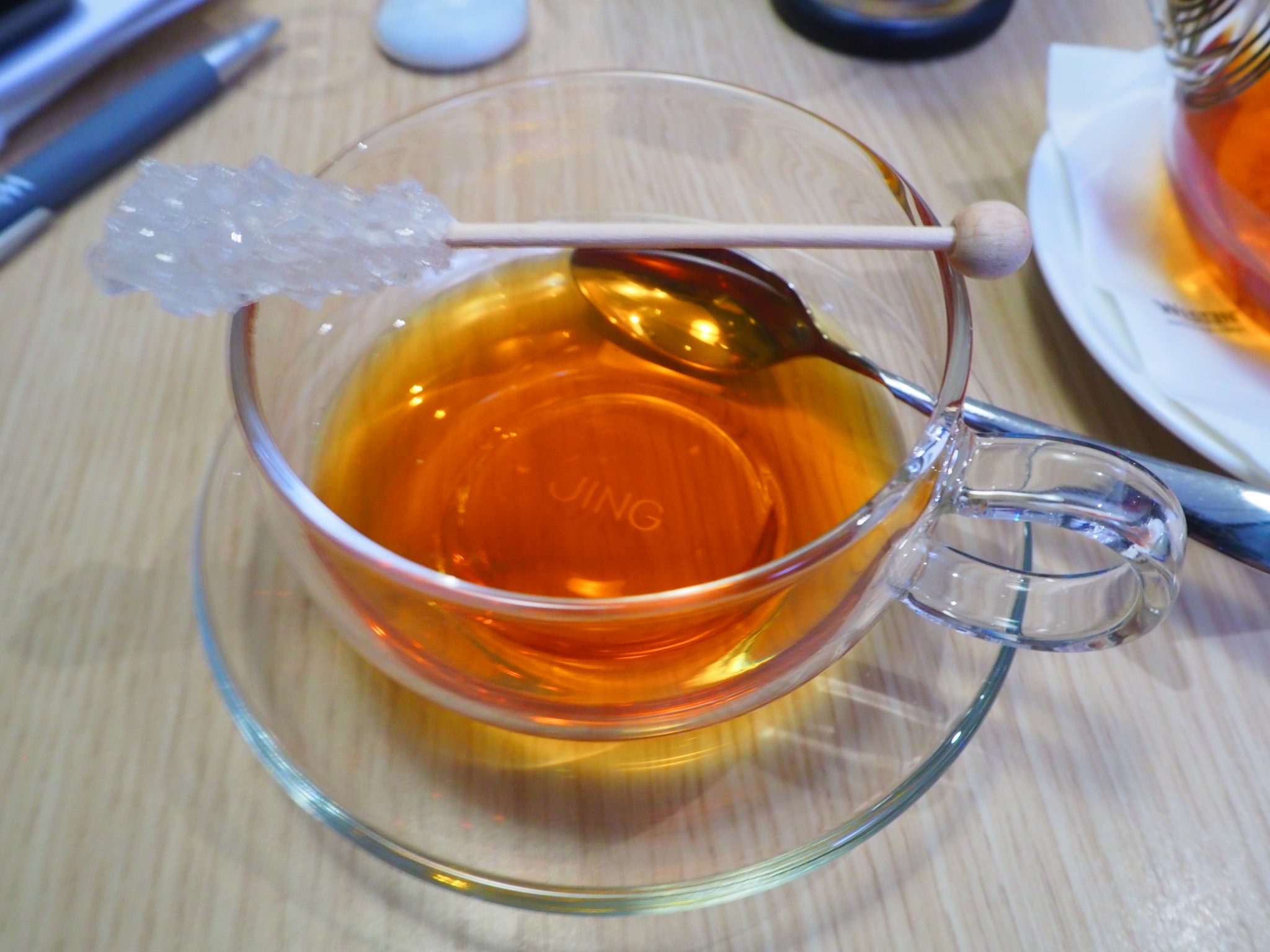 The tea selection is from JING, which is far from my favourite brand. The teapot is made of glass and comes with an hourglass so guests can brew the tea at the right strength.