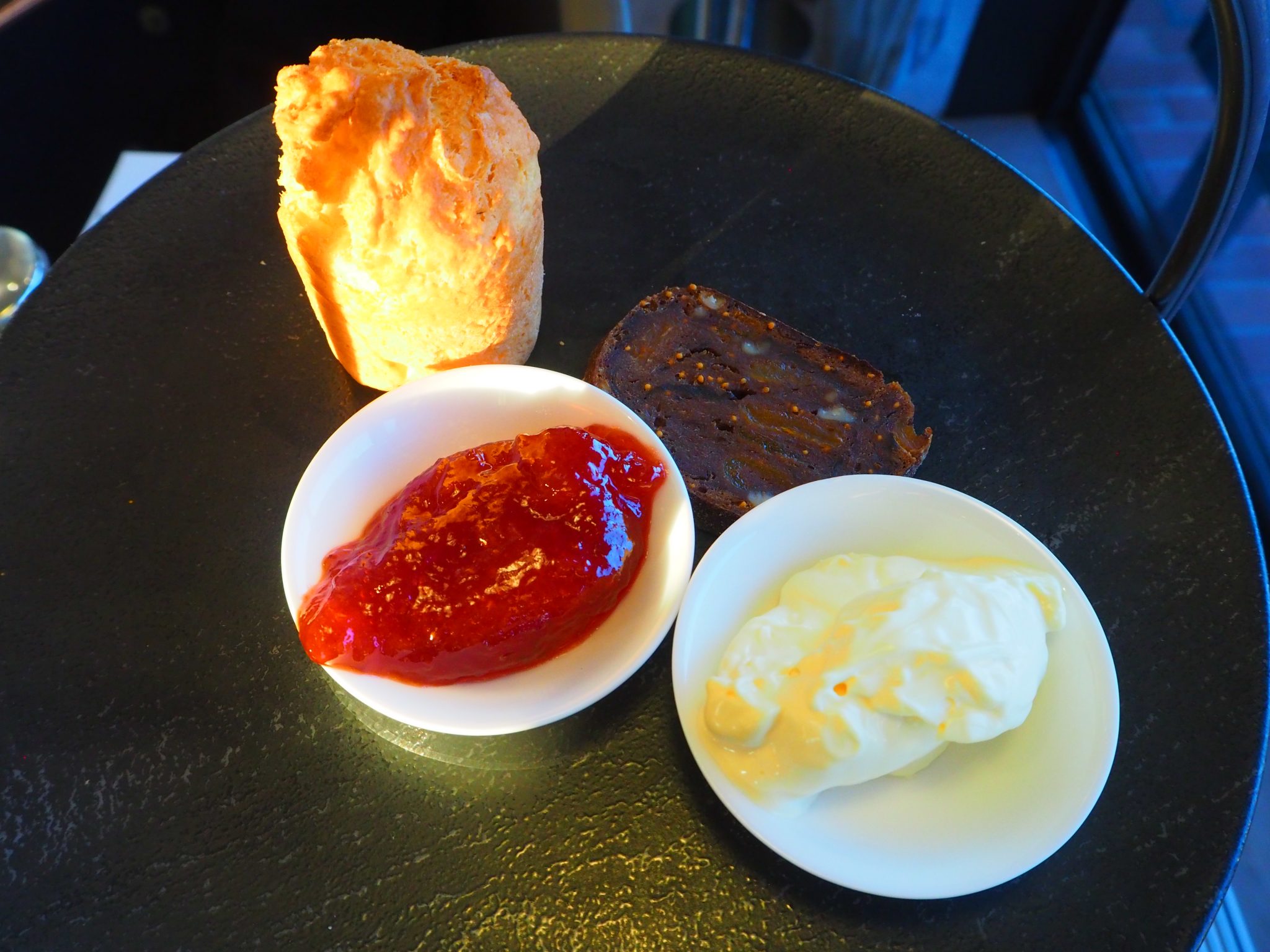 The scone comes with jam and clotted cream. The sweet black bread is a nice touch, actually way tastier than the scone itself.