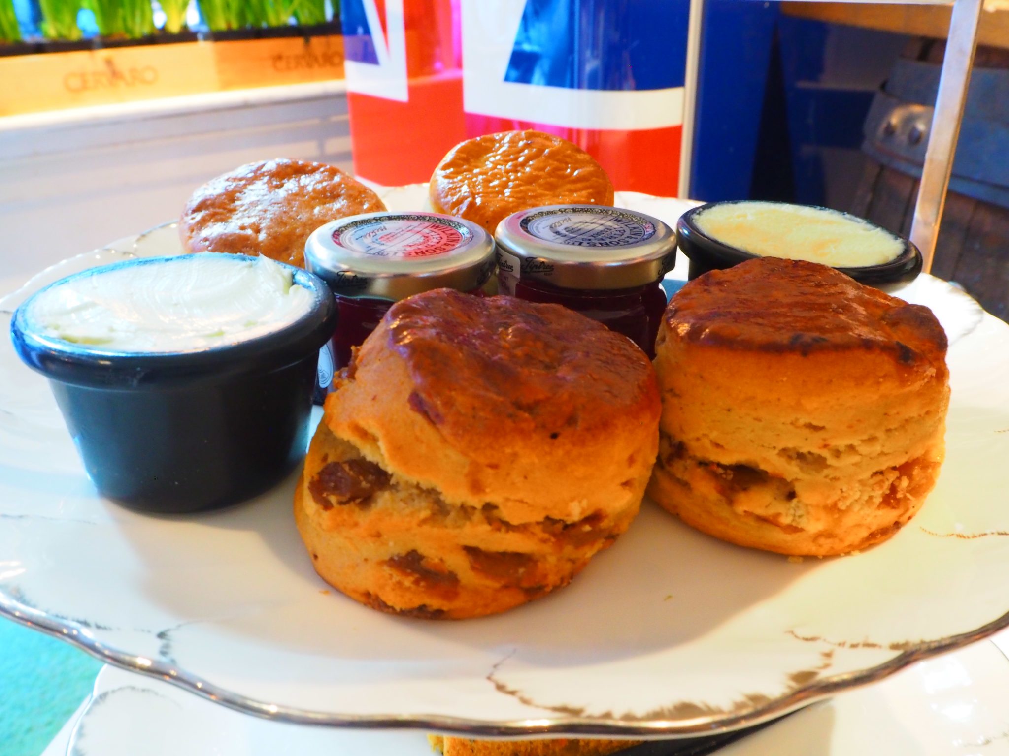 Each guest gets one plain and one fruit scone, served with the usual strawberry jam and clotted cream. Once again, nothing to report.