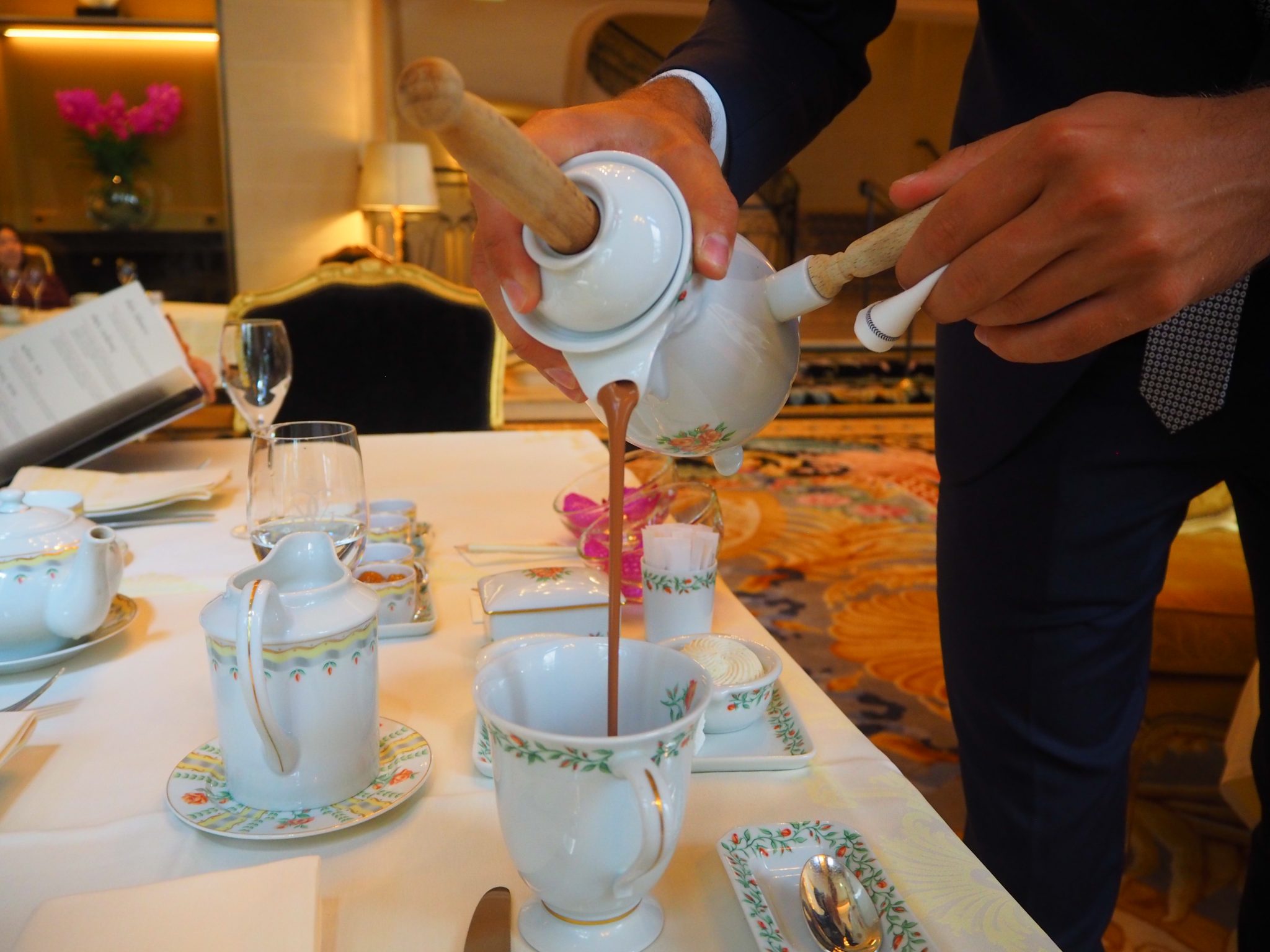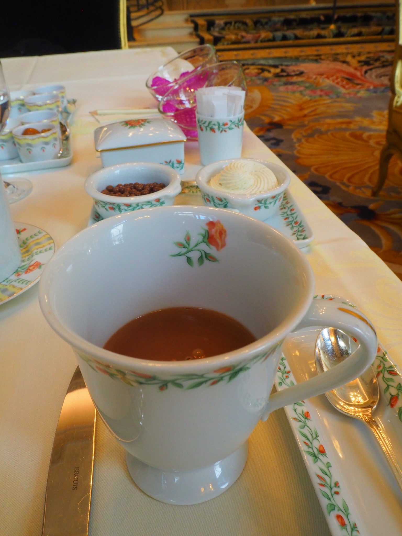 Si vous avez pleinement confiance en votre appétit, le » Chocolat Chaud grand cru » du George V vaut le détour. Celui-ci est accompagné de lait, de crème et de perles de chocolat pour ceux qui souhaitent l’adoucir ou le rendre encore plus chocolaté. Le chocolat en lui même est délicieux, je vous recommande de le boire pur, tout du moins pour commencer.