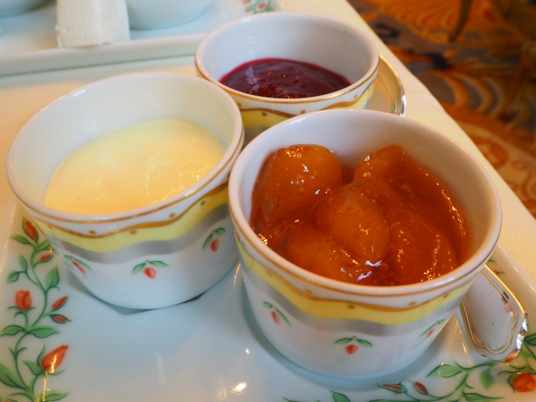 Le tea time du George V comprend deux scones: nature et amandes / framboises. Ils sont accompagnés de clotted cream, de confiture de framboises et d’une confiture aux cerises blanches d’Alsace. Cette dernière est si bonne qu’elle justifierait presque à elle seule un score parfait pour cette catégorie!