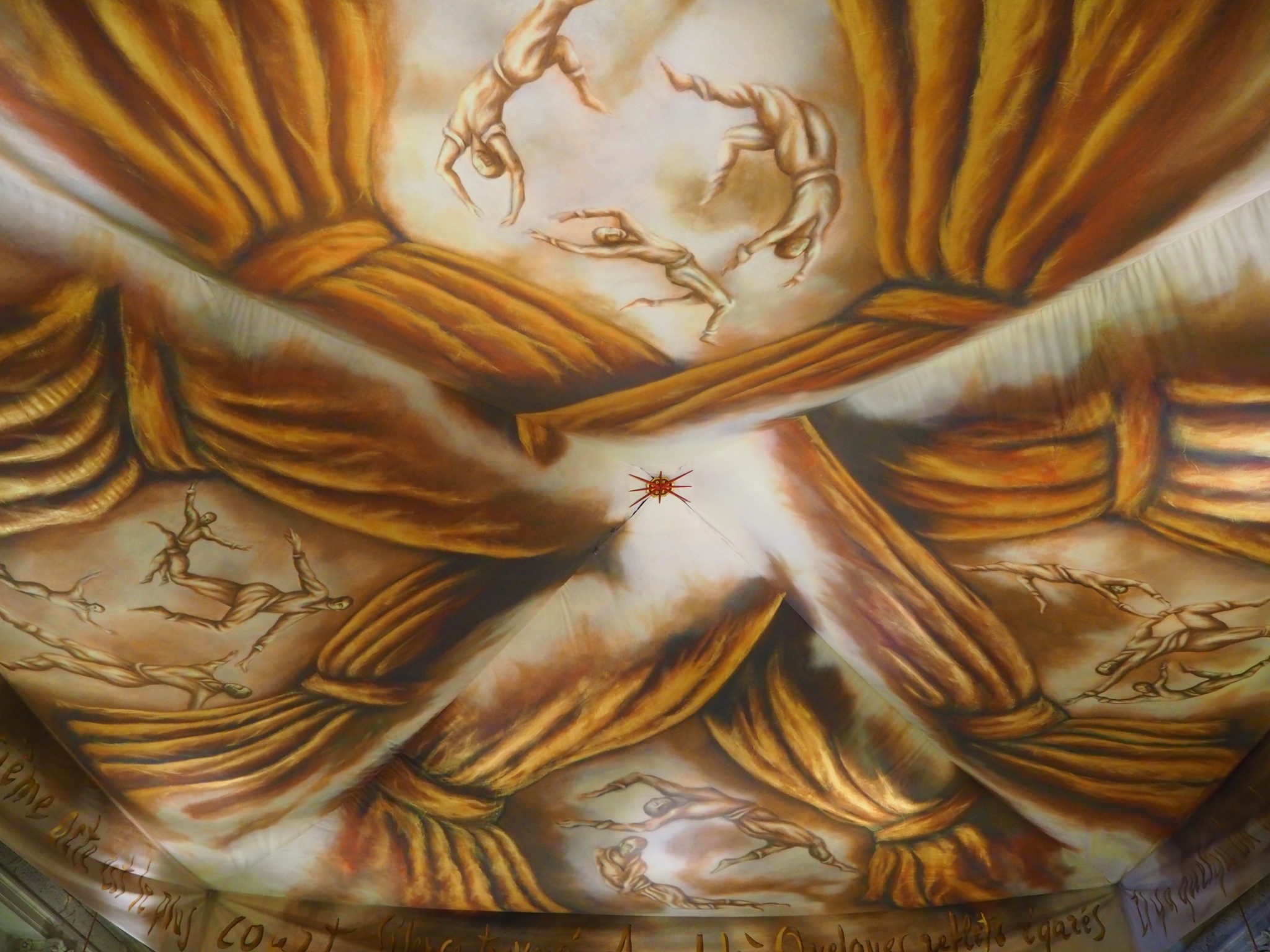 La partie la plus tape à l’oeuil de cette décoration est la grande toile qui recouvre le plafond, fruit d’une collaboration entre Phillipe Starck et sa fille Ara Starck; pour ma part, je ne goûte guère ce style « kitsch ». L’éclairage vers le haut se reflète sur la toile, ce qui explique le teint un peu fade et jaunâtre des photos ci-dessous…