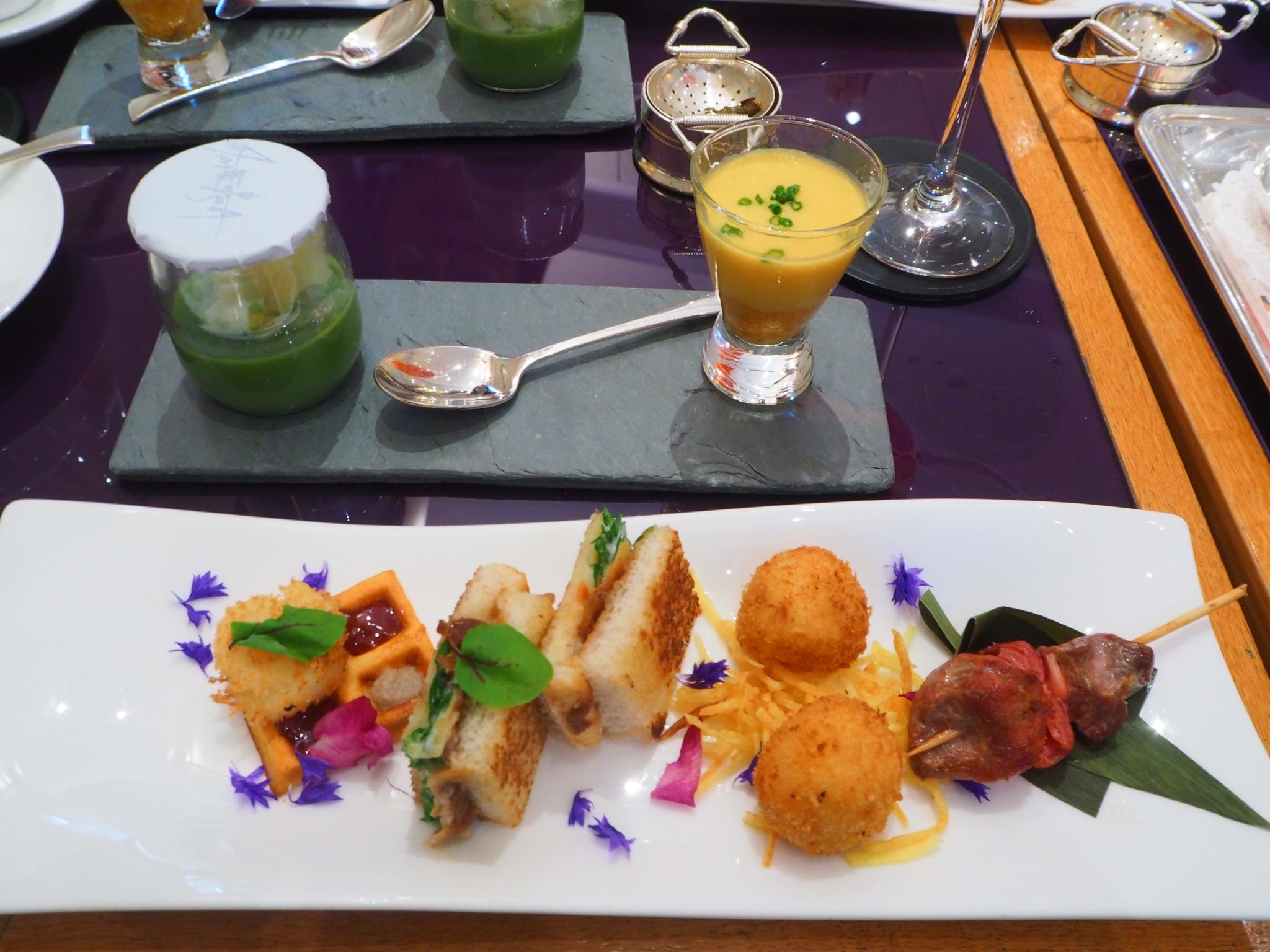 This Spanish afternoon tea shines with its savouries. The staff recommends that guests start with two amuse-bouche (placed on the back tile in the pictures below):