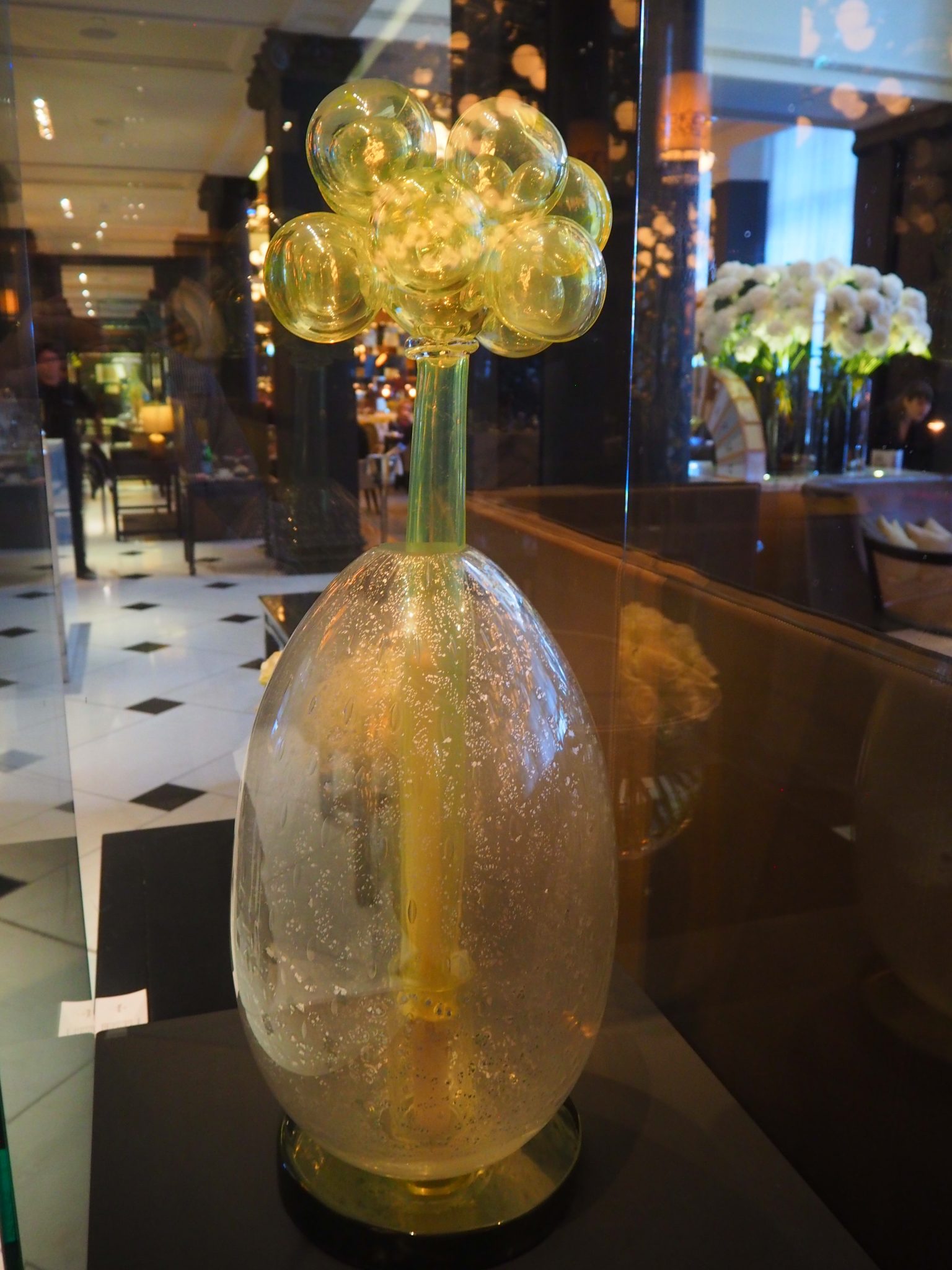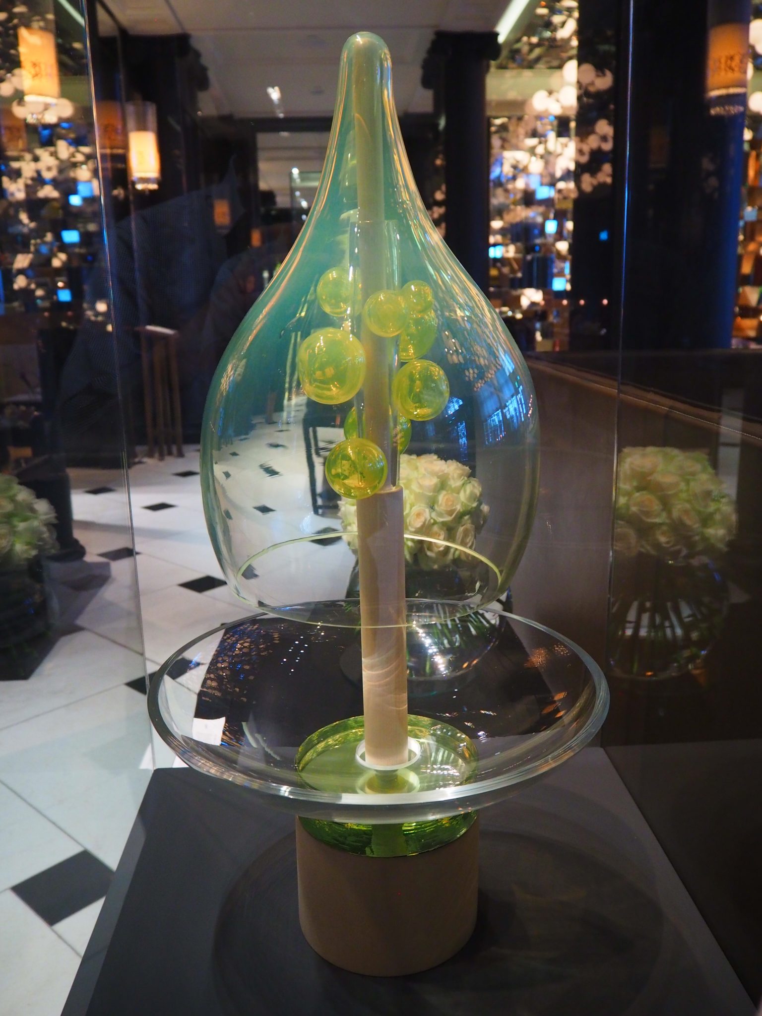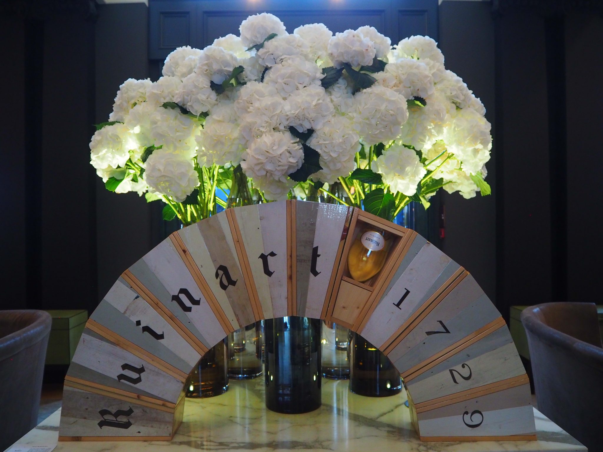 There is an arch made of bottles of champagne standing right in the middle of the lounge and opposite a gigantic flower bouquet. French artist Hubert Le Gall has designed three glass sculptures for Ruinart, each represents a different stage of the grape growth in the first 3 months of the harvest.