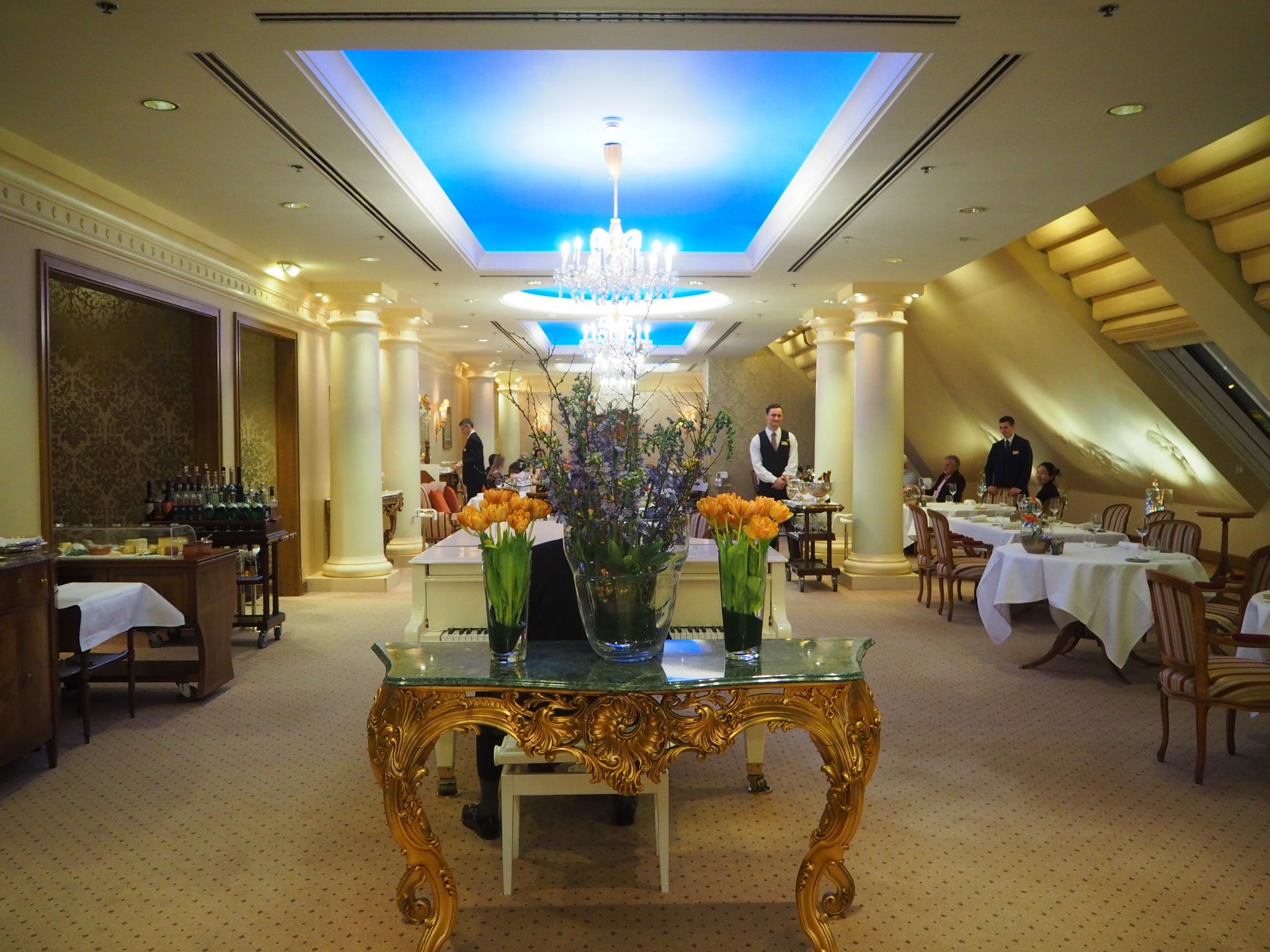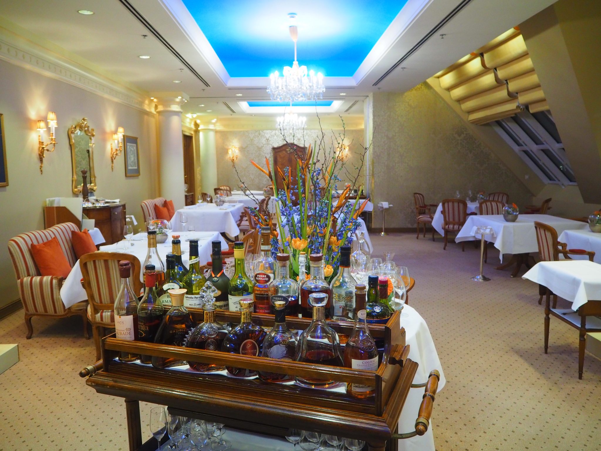 The aptly named “Le Ciel” (the sky in French) is located on the hotel’s seventh floor. The setting is magnificent, with flowers, blue ceilings and chandeliers.
