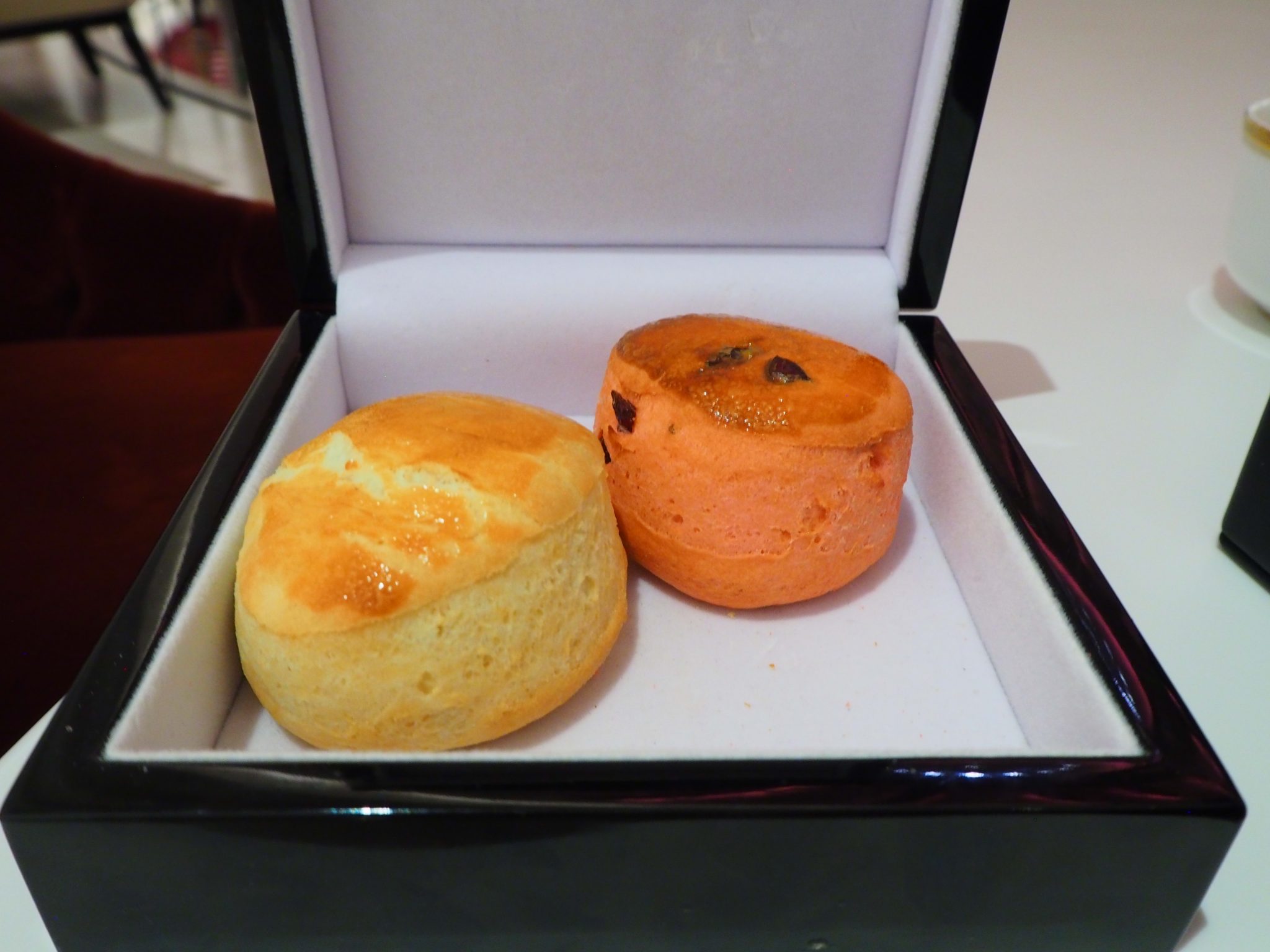 The Plain and Cranberry & Cognac scones are served freshly baked in a dedicated box that keeps them warm. I’m always happy when the scones are served warm and/or in a blanket but a box is such an ideal container that I can’t believe it’s the first time I get served scones this way…