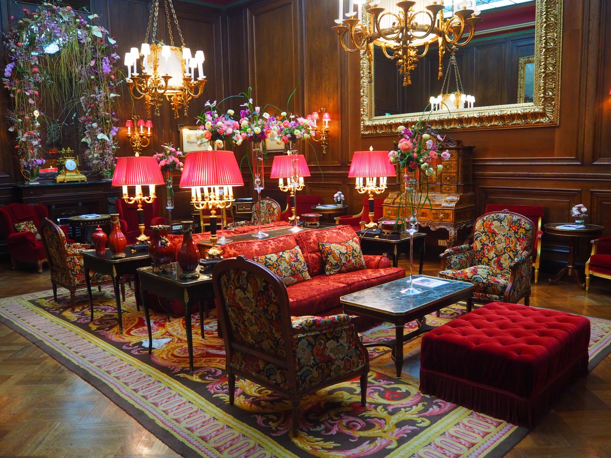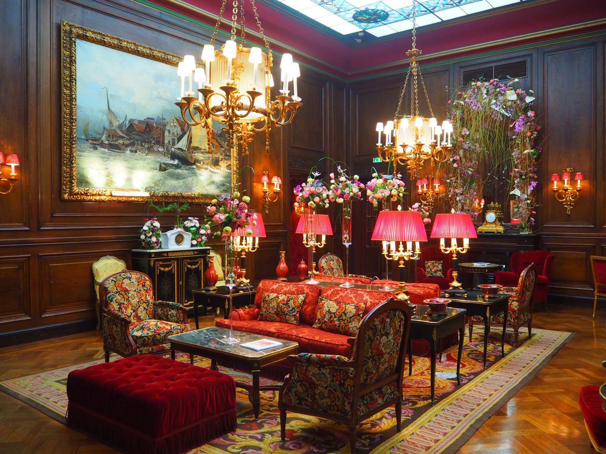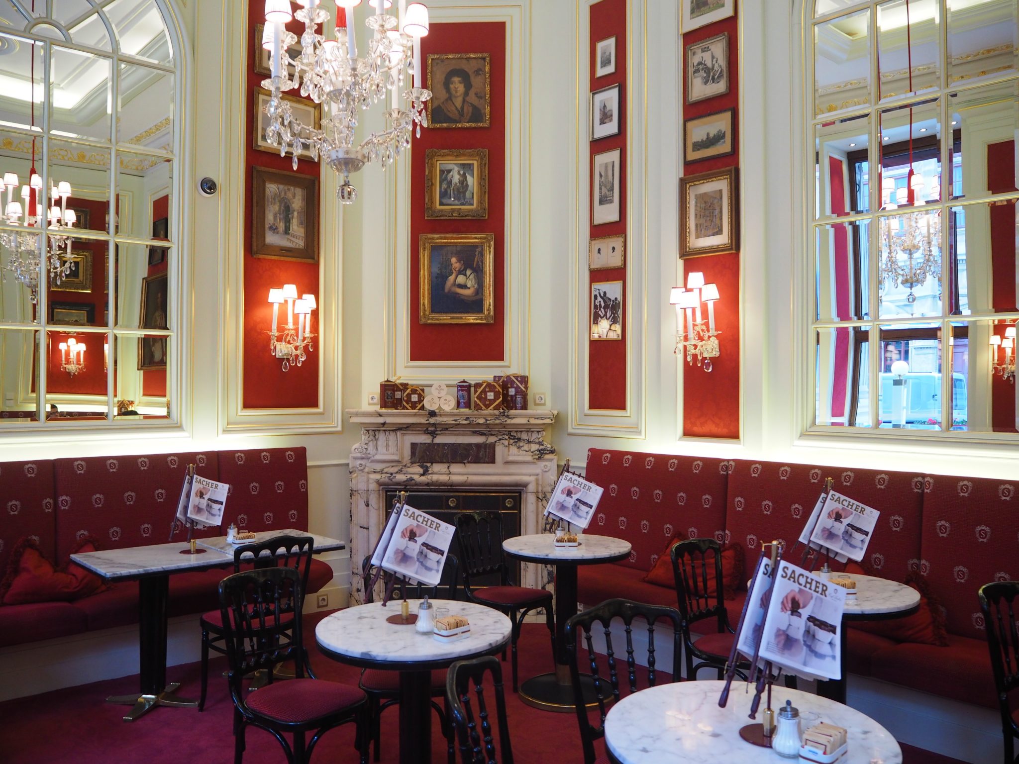 The Sacher interior is grandiose, with predominantly red interiors illuminated by some impressive chandeliers.