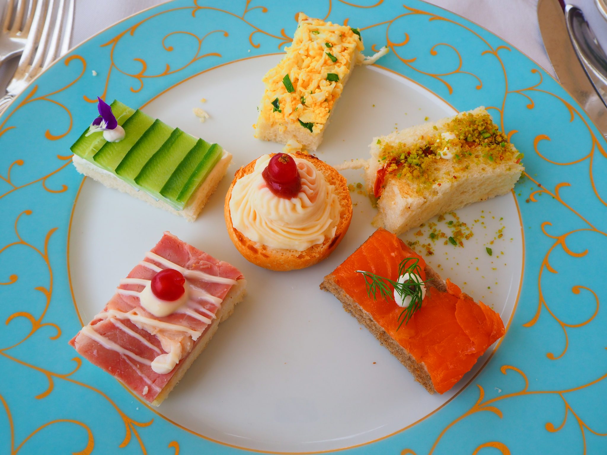 The afternoon tea starts with five cold spreads and one tart, reminiscent of what you’d be served in London: