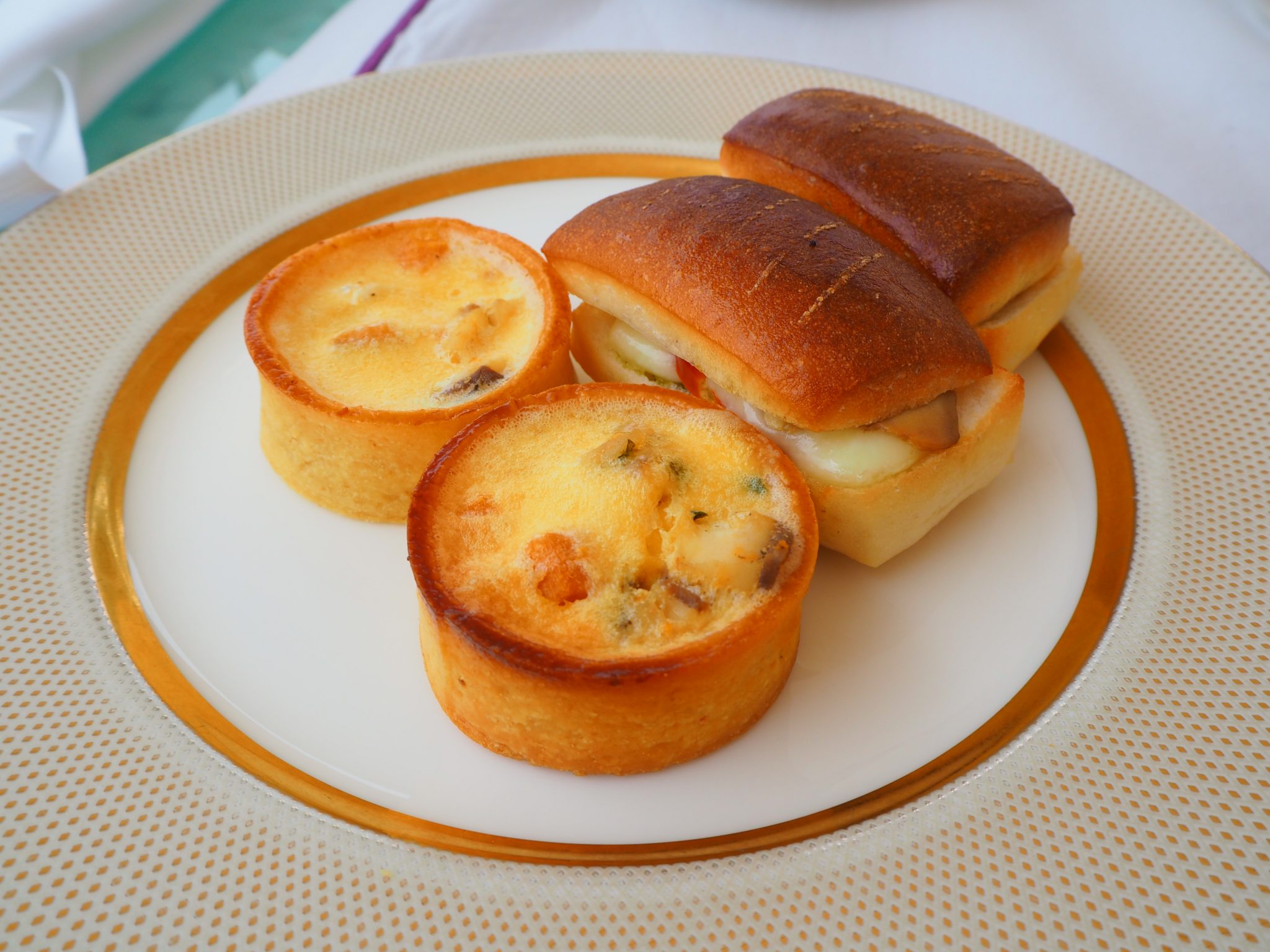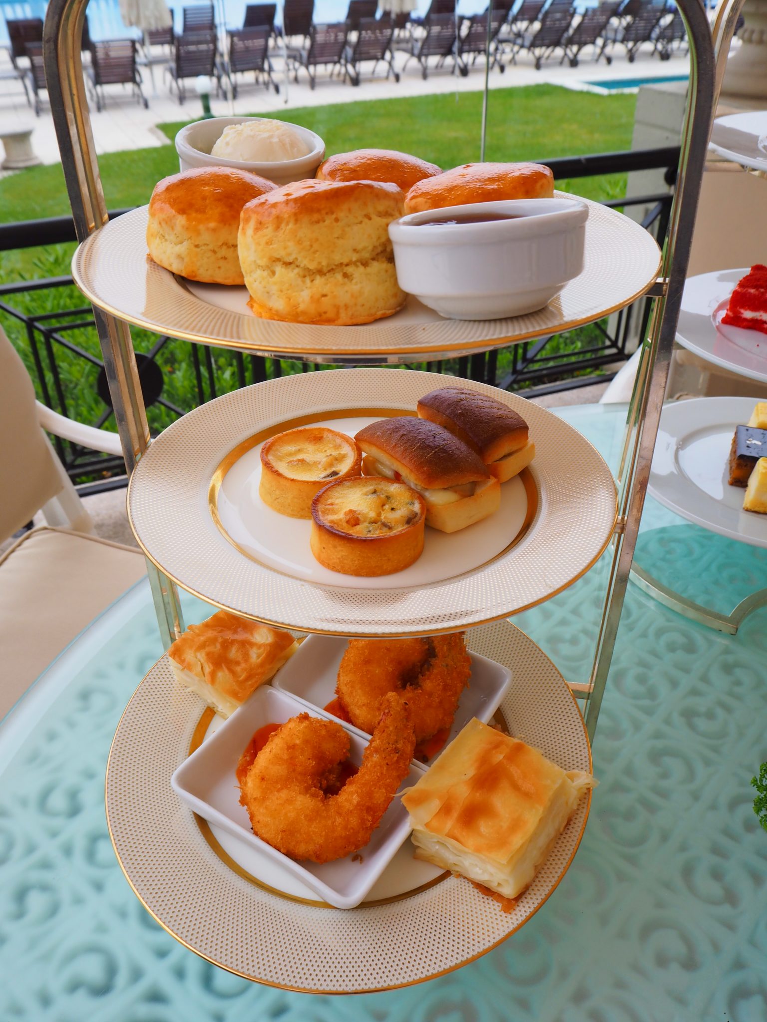 The hot savouries are then brought on the three-tier stand, along with the scones and cakes.