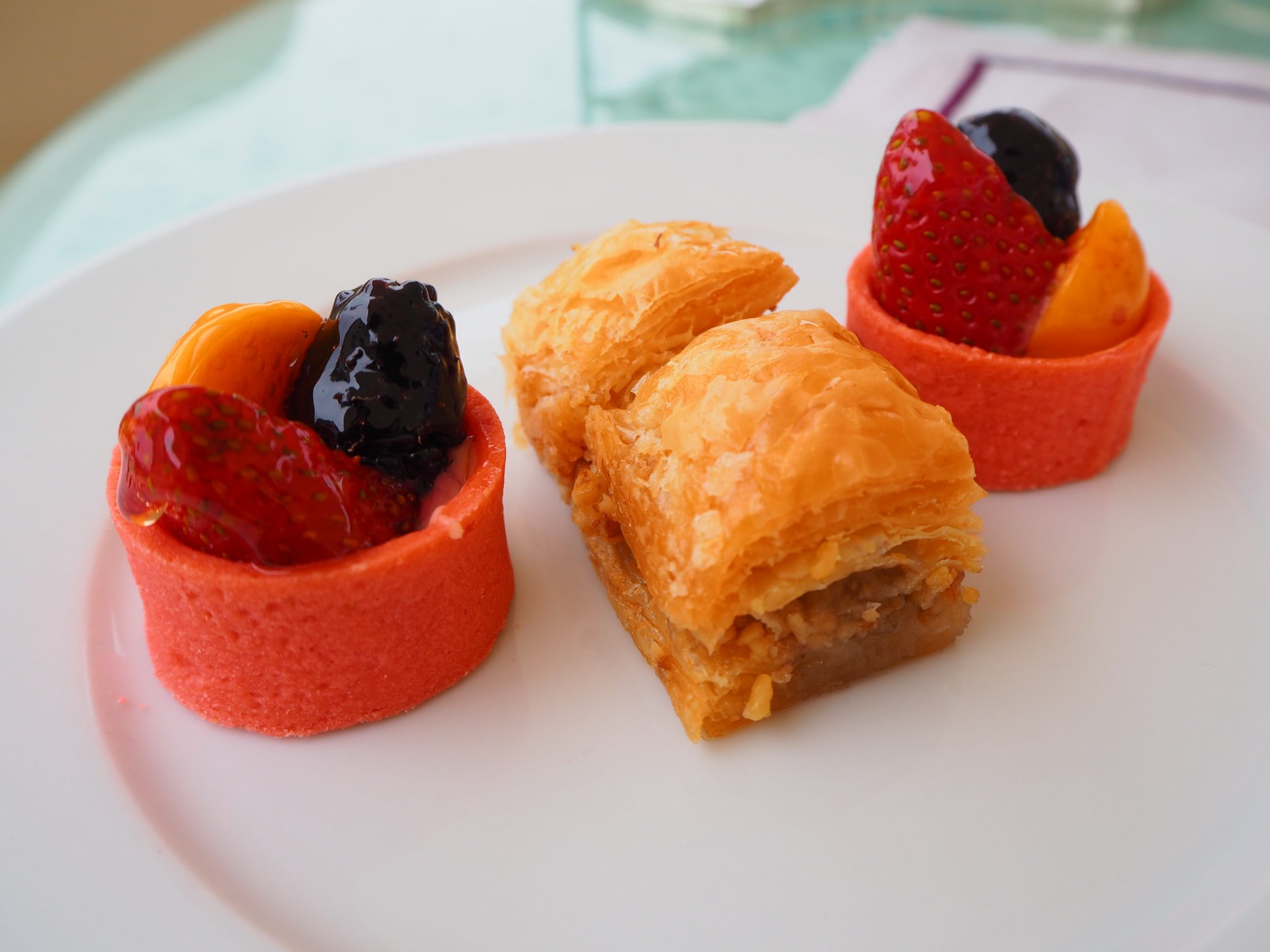 The scones are served with strawberry jam and Turkish clotted cream (which is closer to whipped cream). Both scones are nice and soft but as they are brought along with the hot savouries, it is quite likely that they won’t be warm once you start eating them.