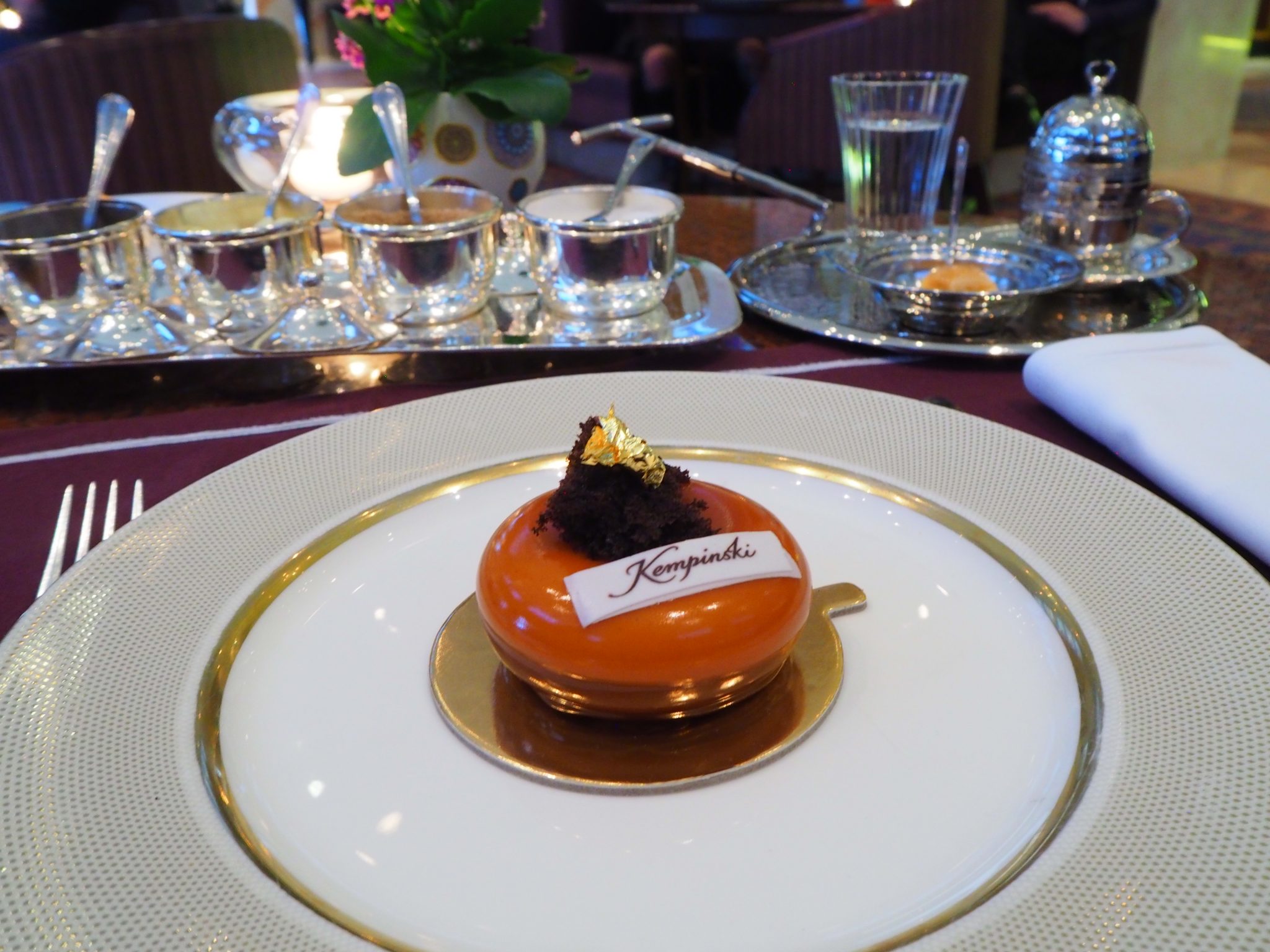 Smaller appetites will be happy to see that there are plenty of cakes and pastries to order. Allow me to suggest the “Kempinski Mondial Cake” (pistachio, white tea, chocolate mousse, crispy almond praline, pineapple & cherry juice).