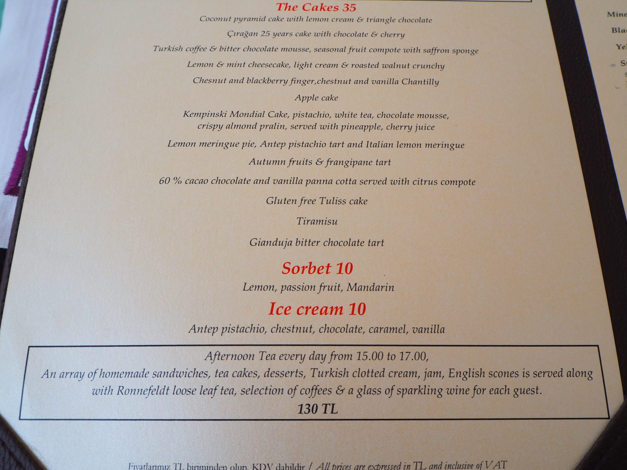 Cakes: 35TL; Ice-cream and Sorbet: 10TL