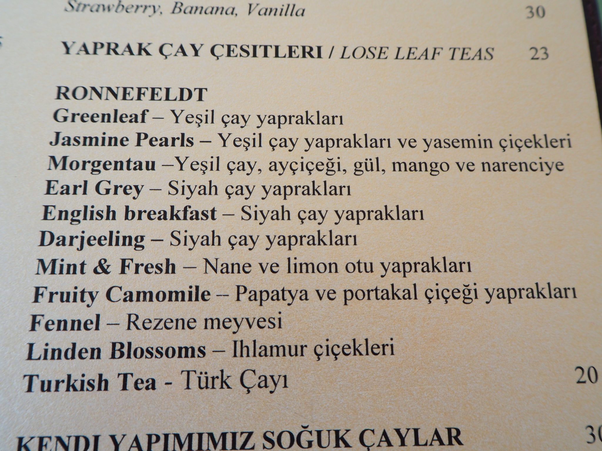 There are 10 teas and infusions from Ronnefeldt, as well as the traditional Turkish tea. While the tea quality was excellent, I was a bit disappointed by the overall lack of choice. There are no white, oolong teas or pu’erh teas on offer.
