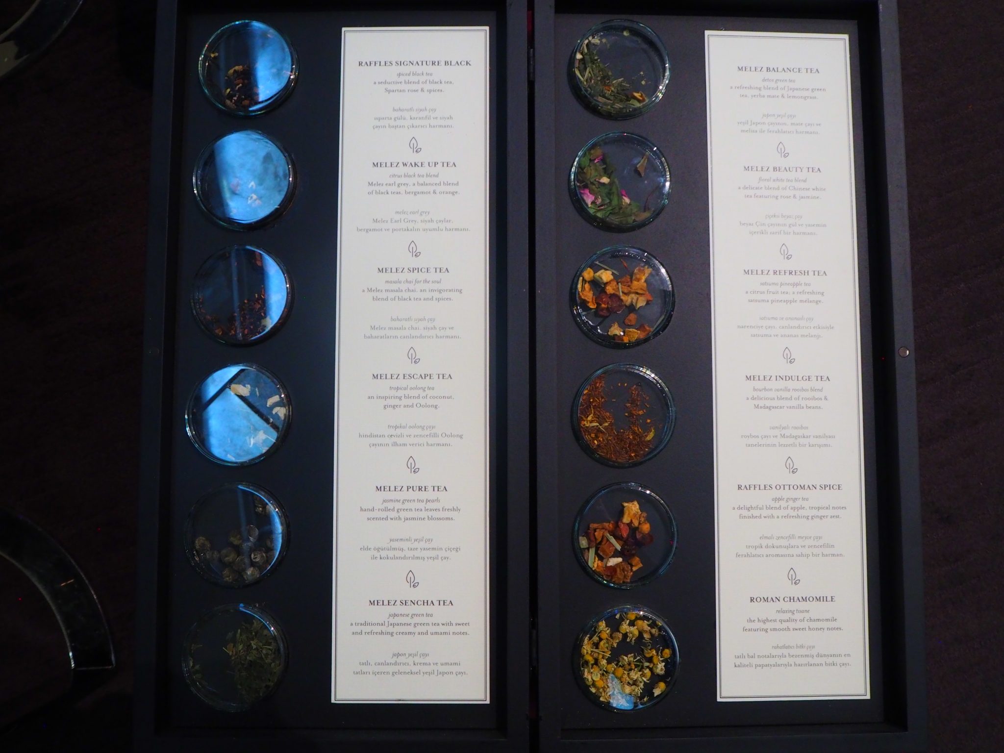 The tea selection is excellent, with 26 teas from Melez (a local supplier) and 2 teas from Palais des Thés (a French supplier). While most hotels in Istanbul serve 15 different teas at most, the Raffles offers the most comprehensive tea selection in the city. It even includes white and oolong teas, which happen to be my favourite.