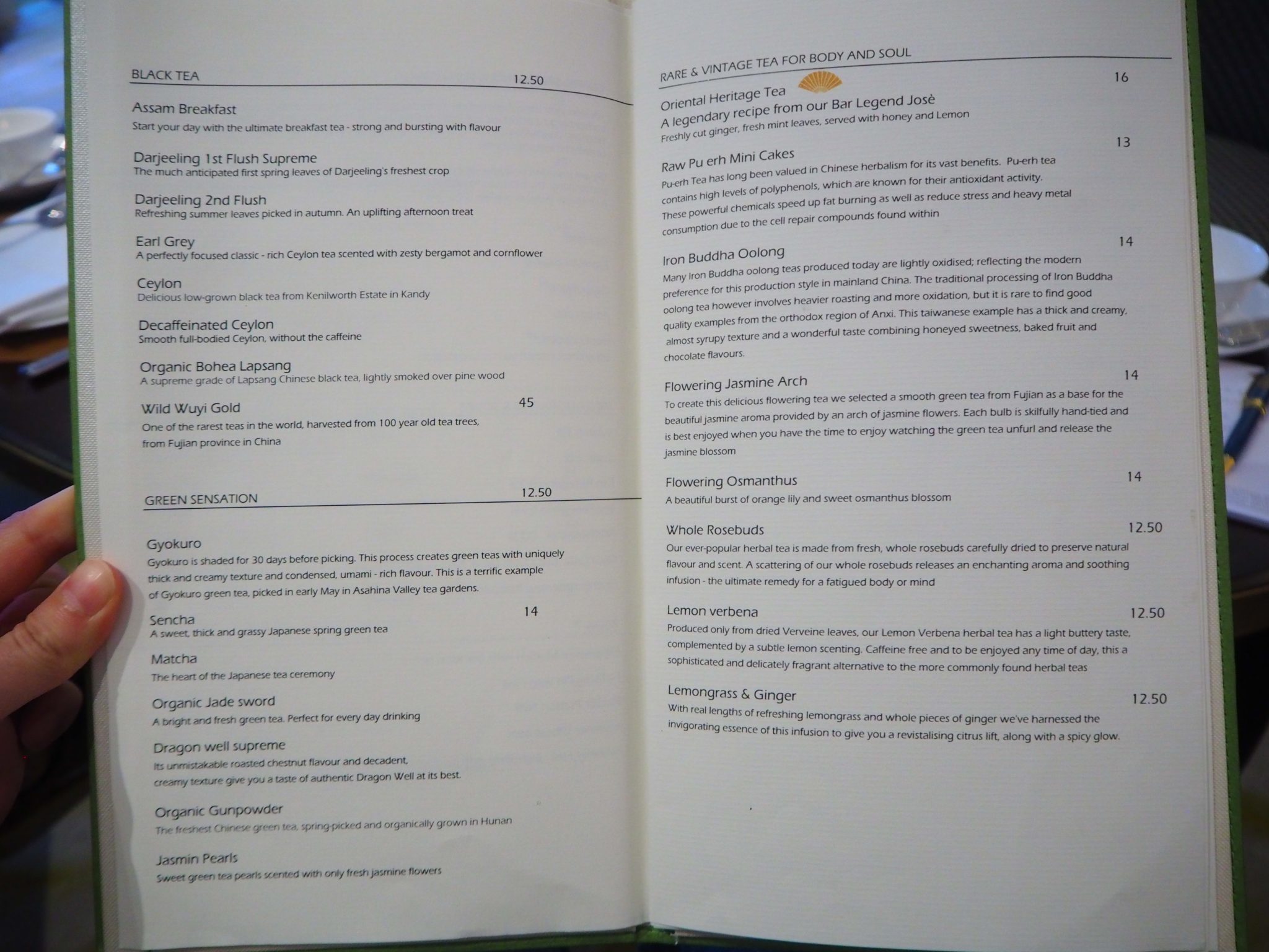 There are 23 teas and infusions on offer, sourced from the JING tea house. I’m normally not very on the JING tea brand but this particular selection is very good, with many classic teas as well as rare teas. The finest tea is the Wild Wuyi Gold black tea, which will cost 45€ extra (connoisseurs only!).