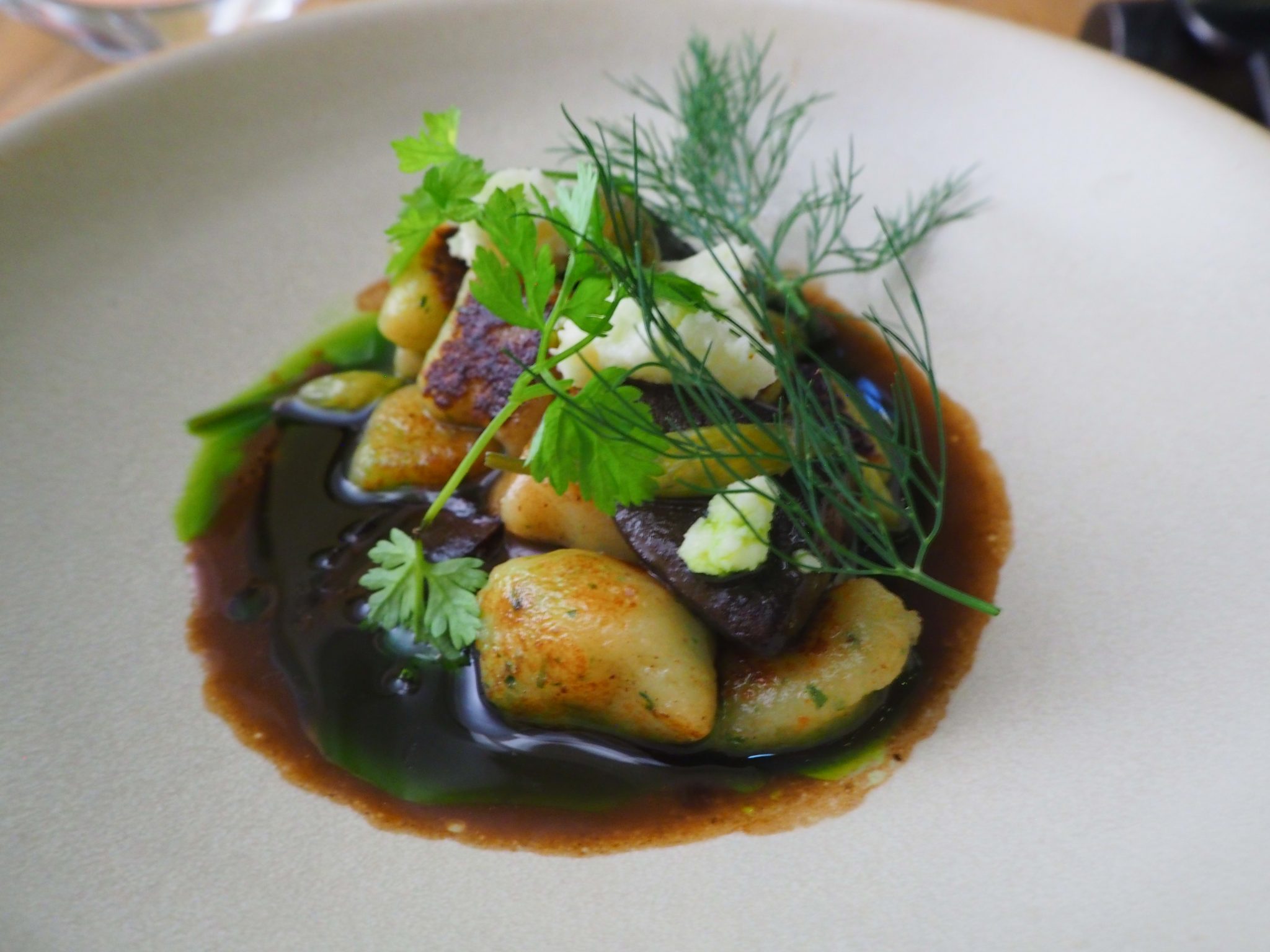 • Potatoes and sheep cheese in a mushroom, wild garlic oil and mint oil demi-glaze, topped with wild garlic and dill