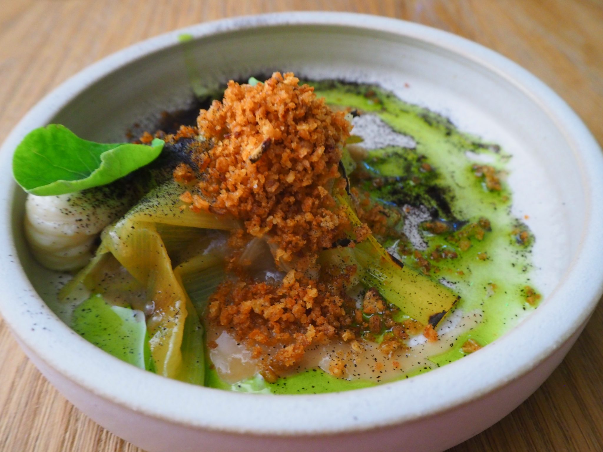 • Baked leek with goat cheese, onions and leek oil topped with bread