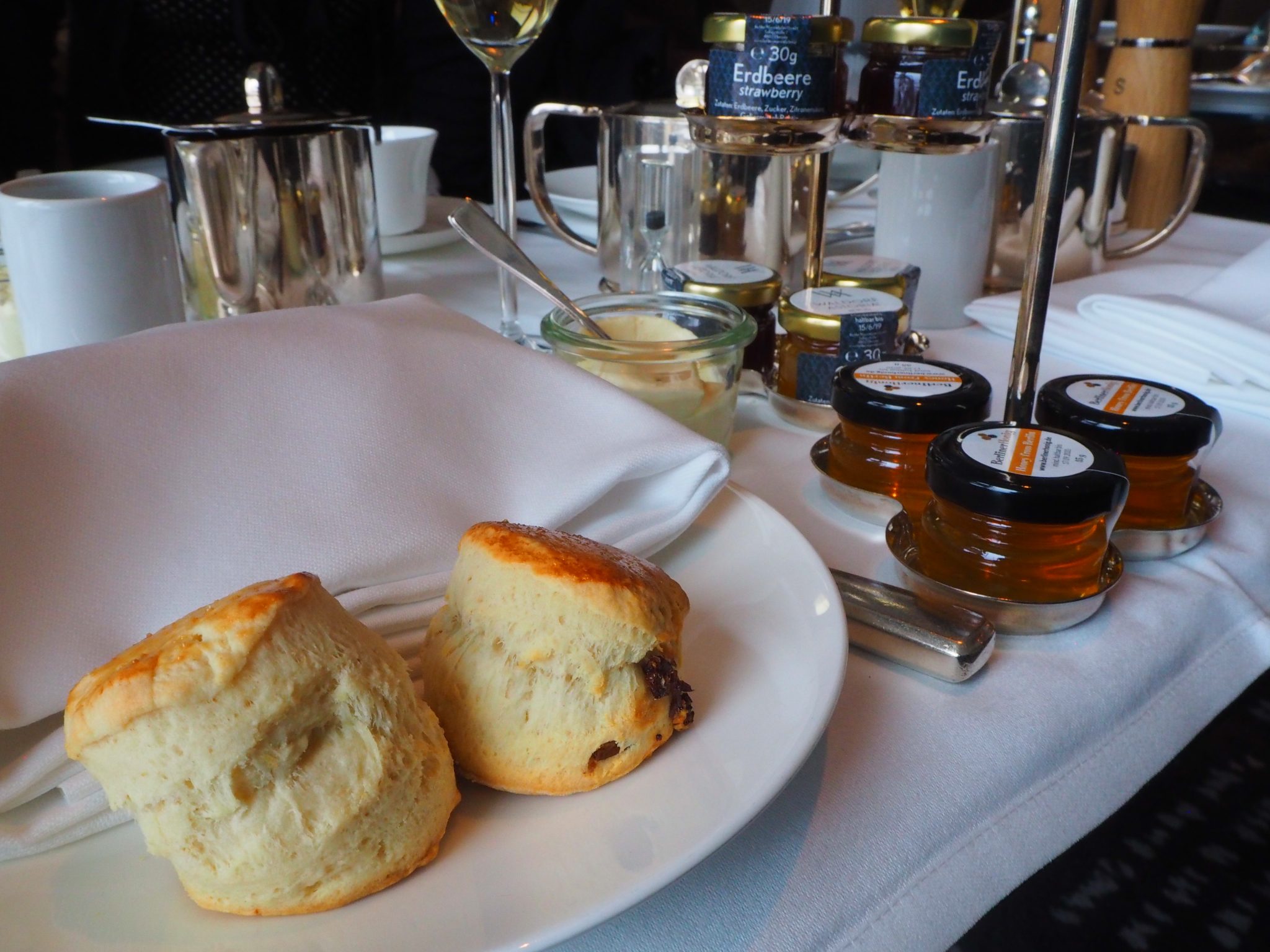 The Plain and Raisin Scones are served wrapped in a blanket to retain the heat. There are plenty of toppings to choose from: strawberry, strawberry-mango ♥, apricot, orange marmelade, cherry; honey and of course, traditional clotted cream.