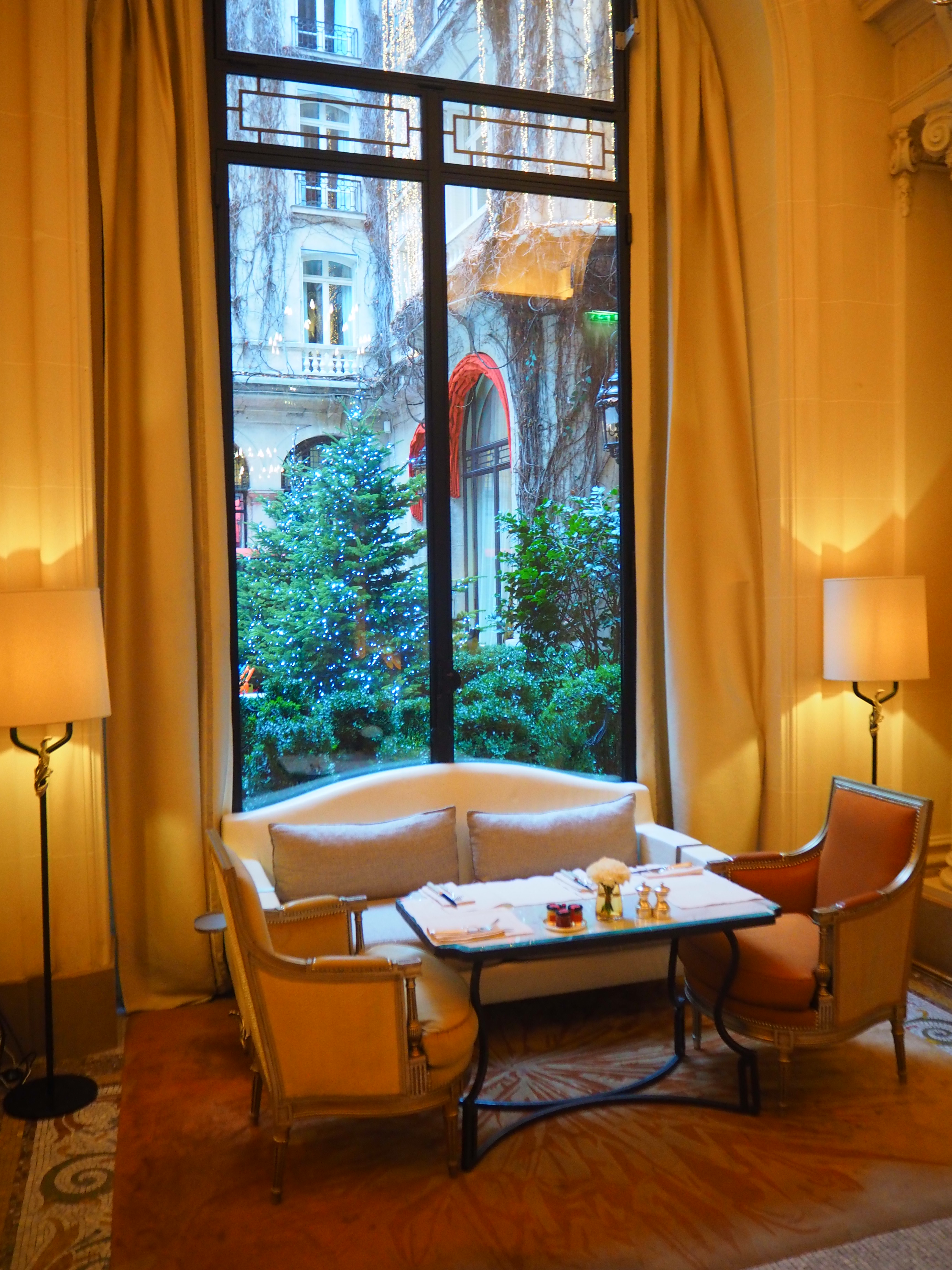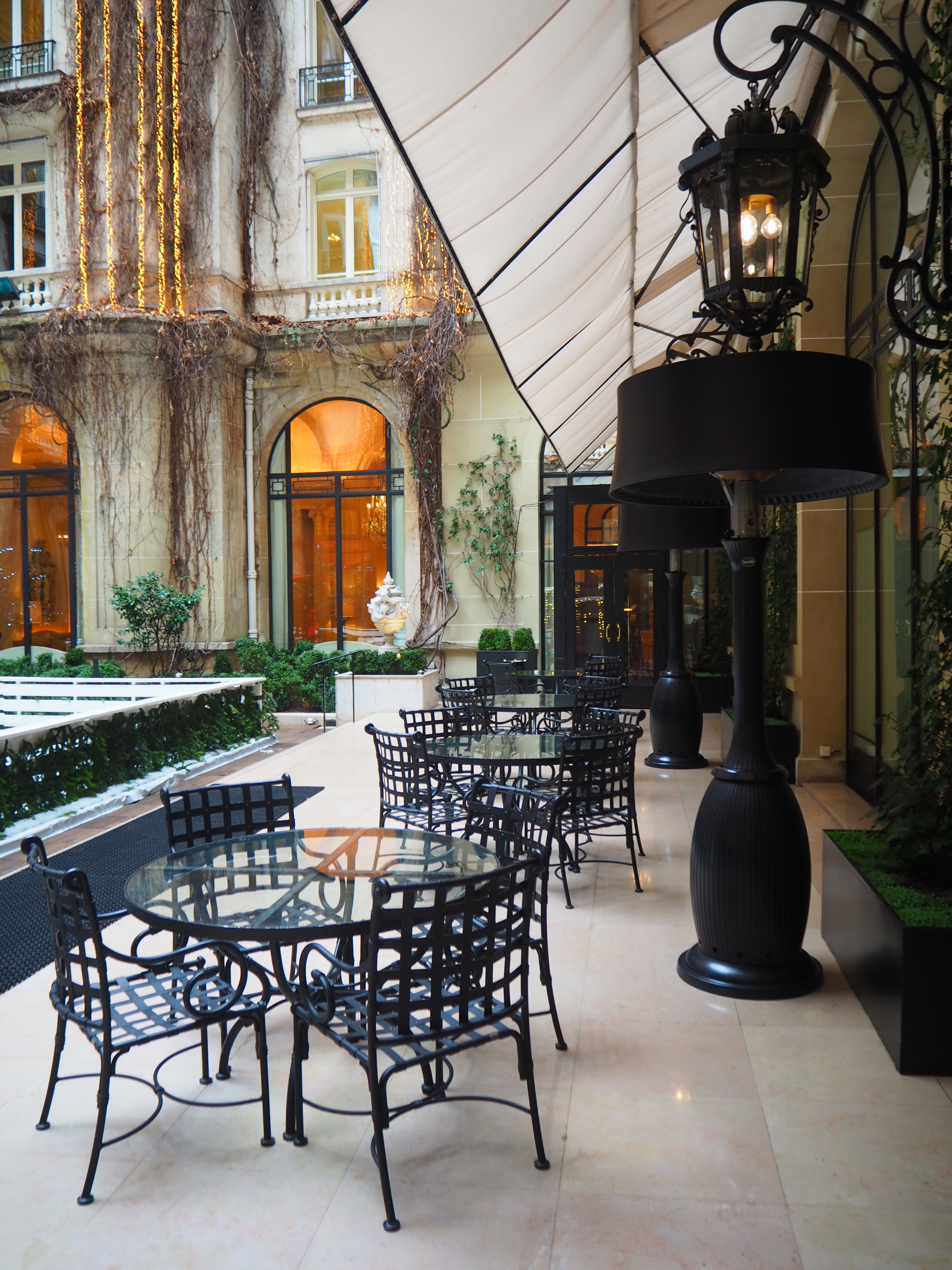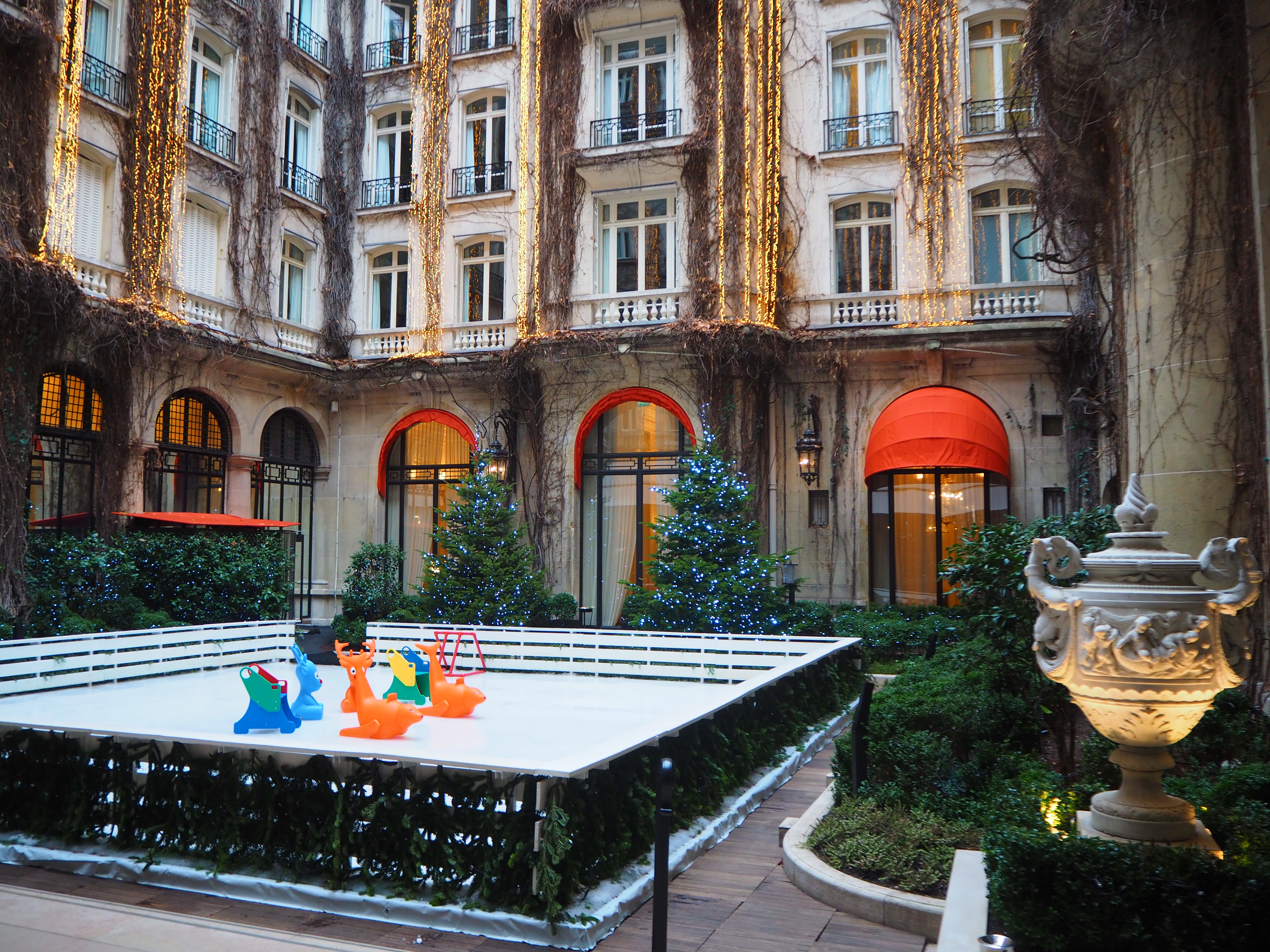 The hotel courtyard’s tables are for the exclusive use of the Alain Ducasse restaurant and afternoon tea is not served there. There currently is an ice-skating rink, which is photographed in the pictures below: