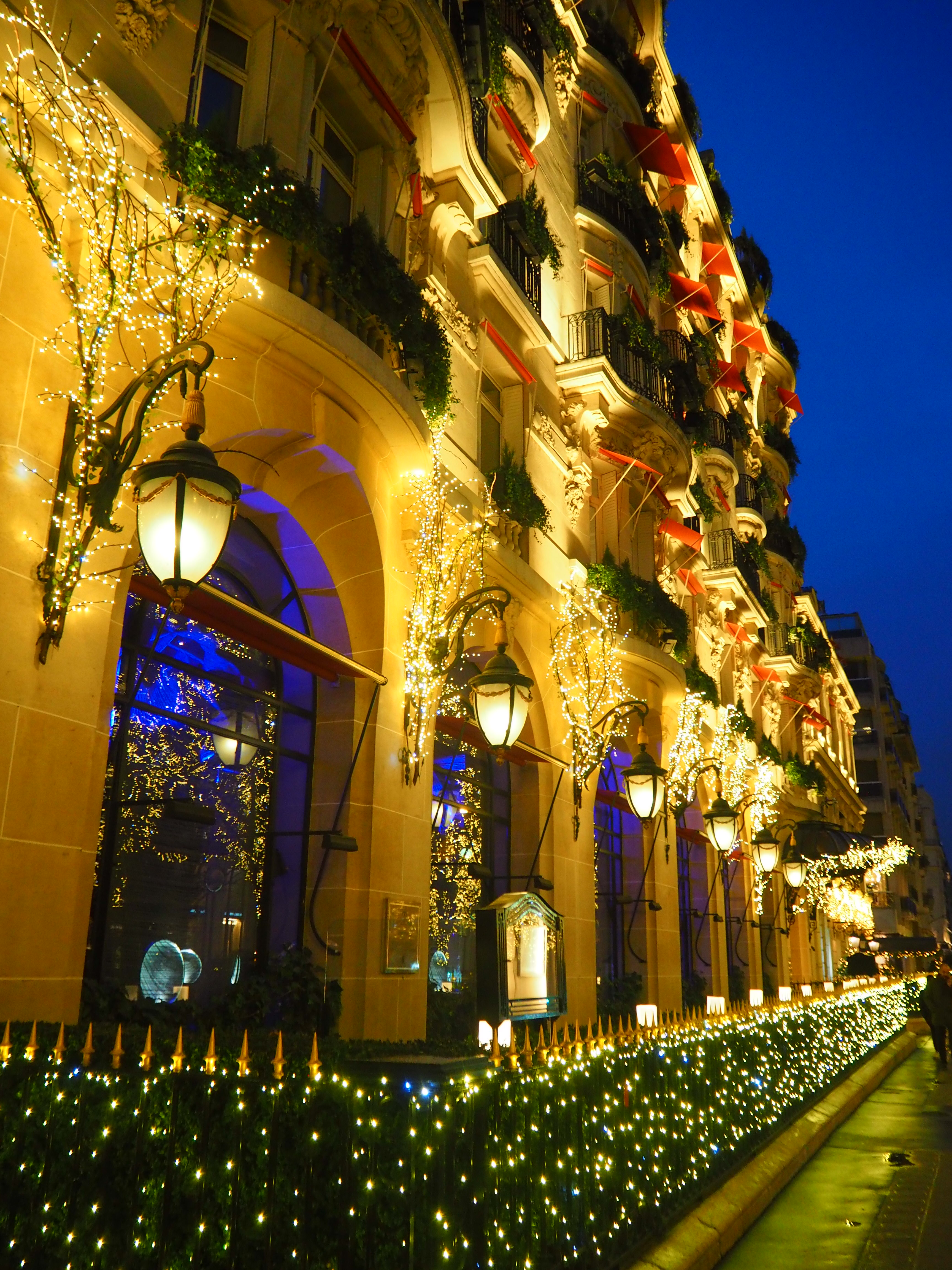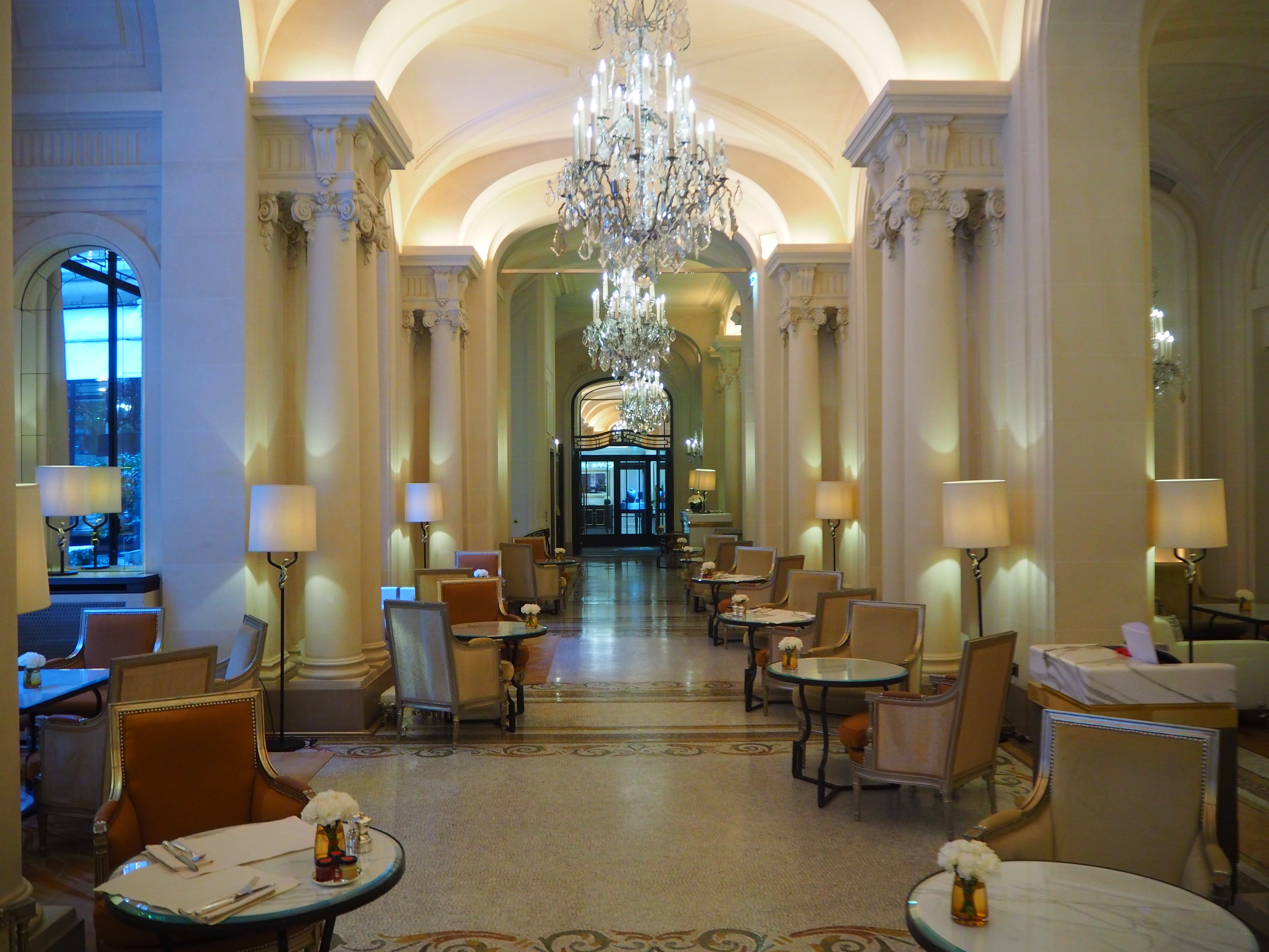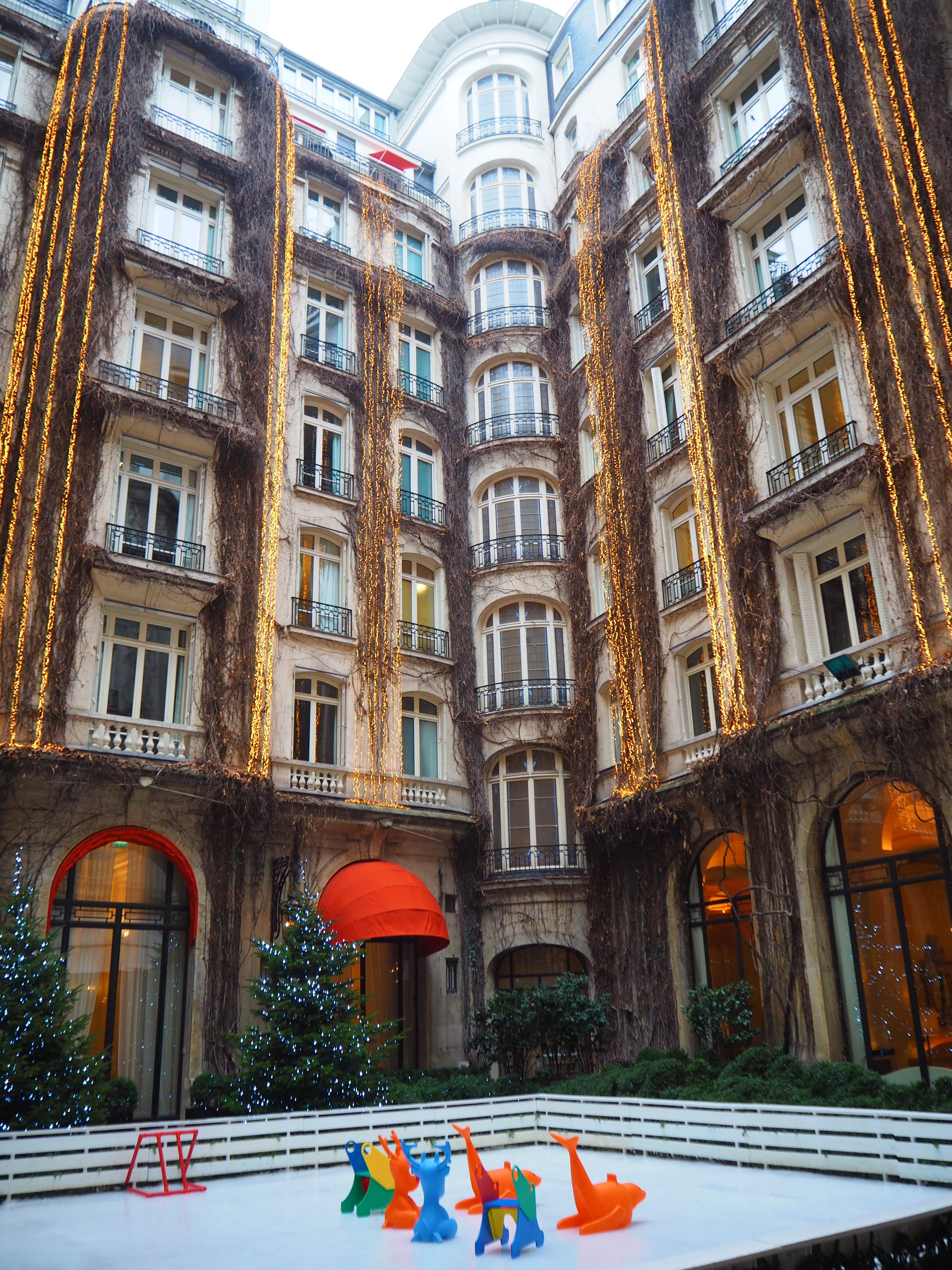 The hotel courtyard’s tables are for the exclusive use of the Alain Ducasse restaurant and afternoon tea is not served there. There currently is an ice-skating rink, which is photographed in the pictures below: