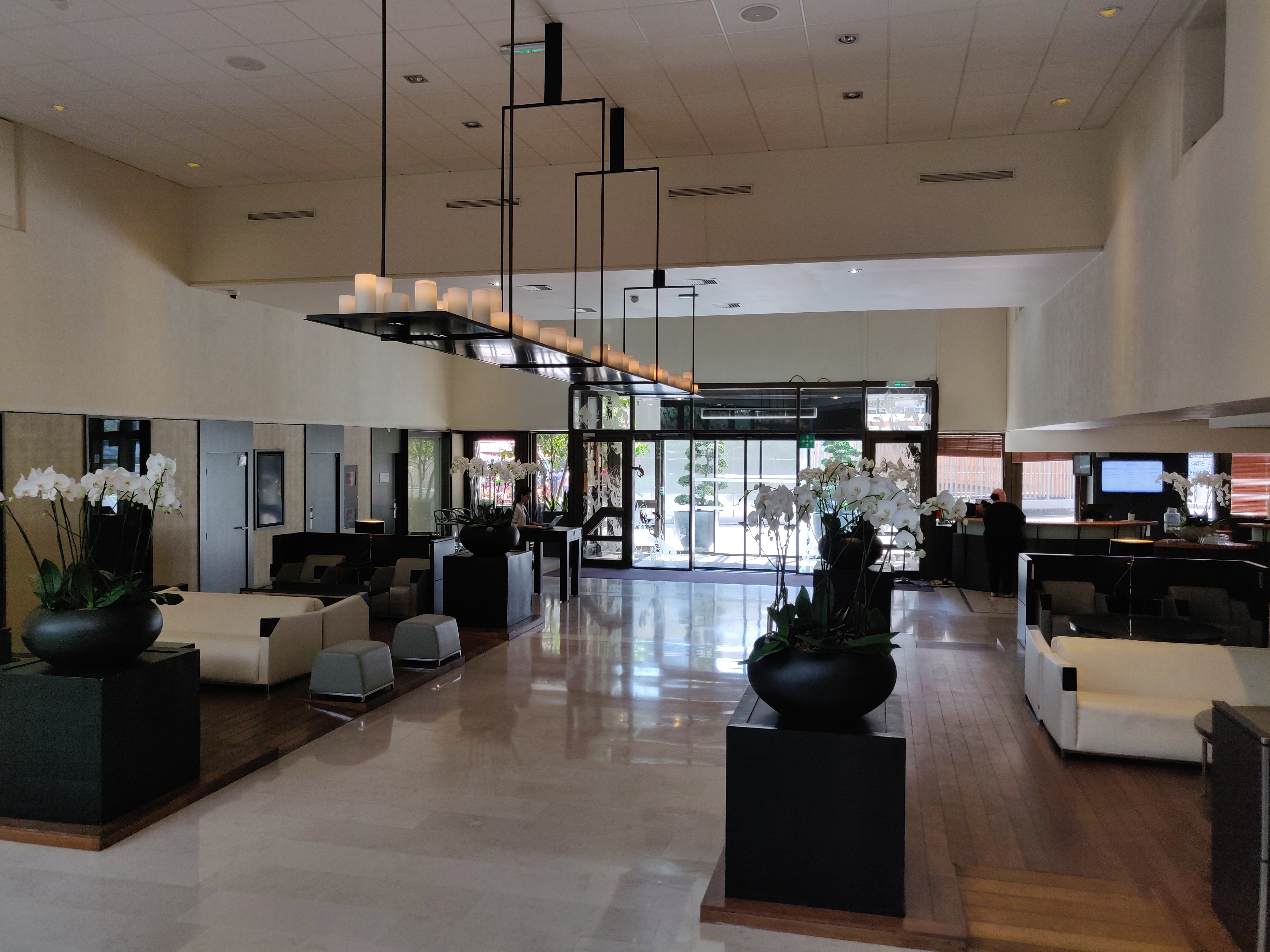 The hotel interior is modern and filled with natural light. The lobby is decorated with beautiful white orchids and murals by artists Mel & Kio.